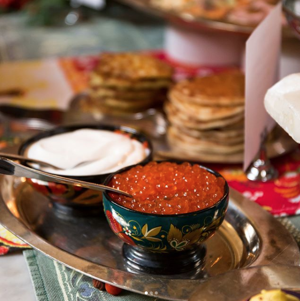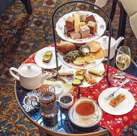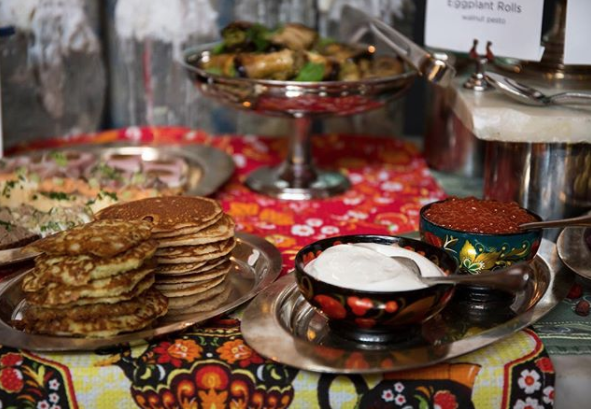 Tables are topped with a feast spread onto three tiers of sweet and savory delights. Look out for the Buterbrodi (open face rye bread sandwiches with various toppings), Stuffed Eggs, and Khachapouri (georgian cheese bread and local honey). There is also an abundance of perogis, smoked fish, and more, so come hungry!
