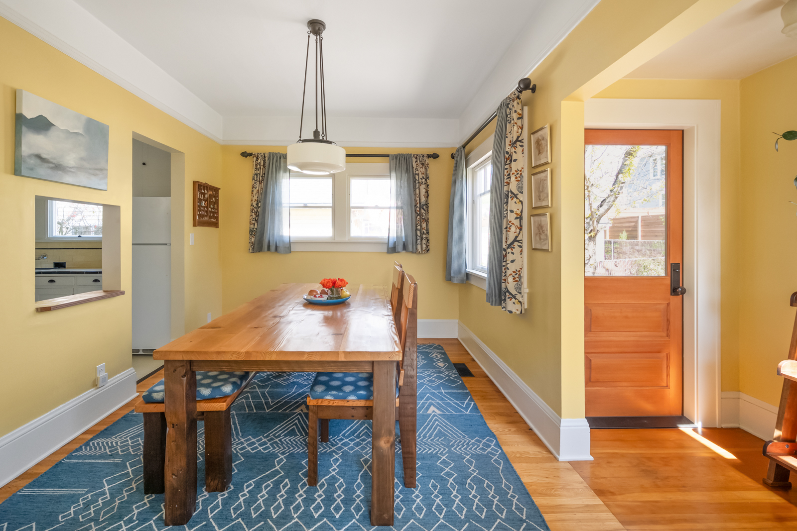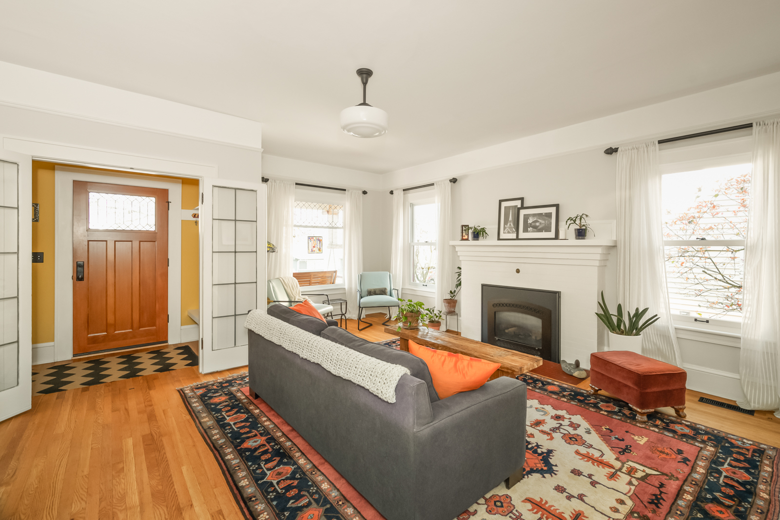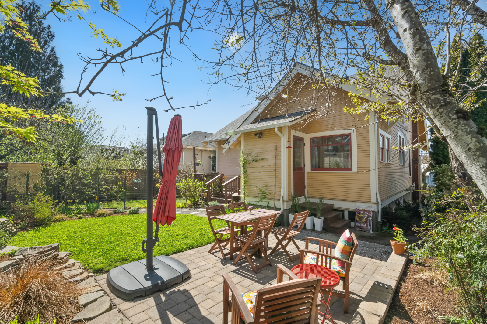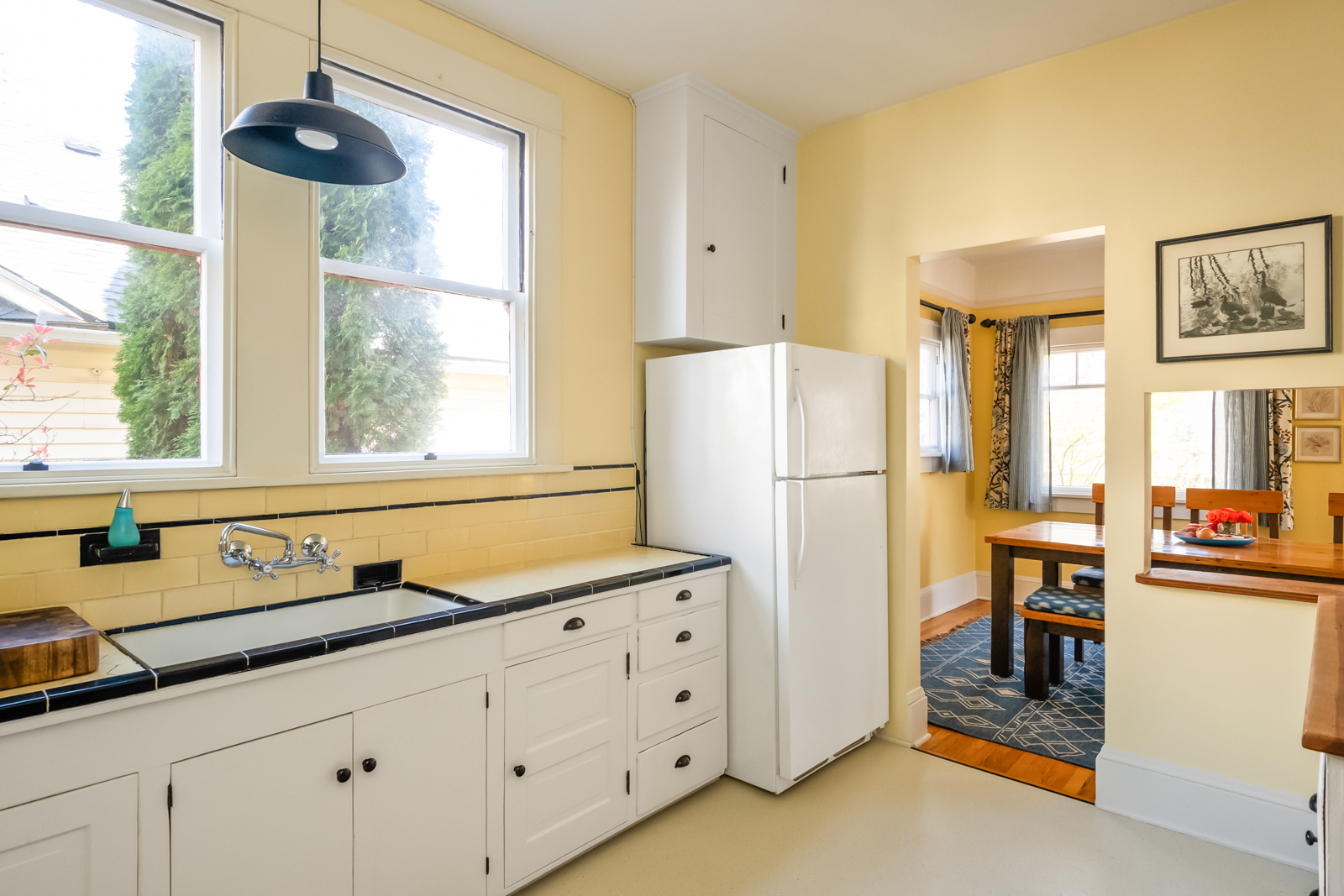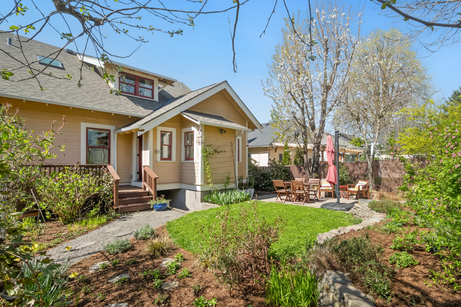 French doors in the foyer open to the main floors spacious living room with a leaded glass window nook, built-ins and gas fireplace. The kitchen is a sunny vintage delight with old school yellow subway tile backsplash and hex tile counters that connects to the light filled dining room with 2 back doors. The lush backyard is filled with intentional and intimate spaces, native and mature plantings, beautiful hardscaping, and a chicken playground. The two main floor bedrooms are roomy with huge windows including a built in window seat facing west in the front bedroom. The entire main floor has 9′ ceilings adding to the homes sense of airiness.