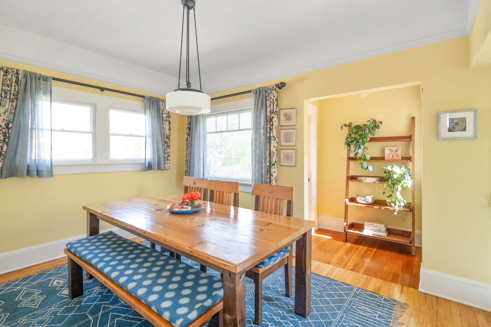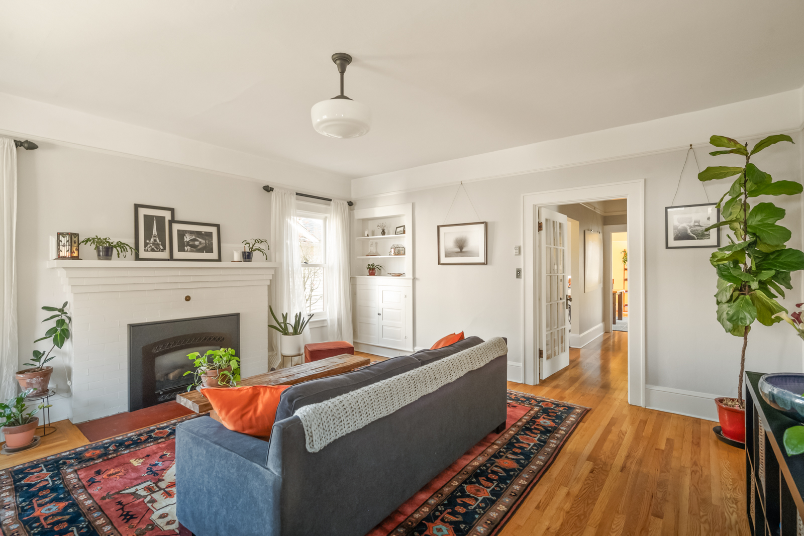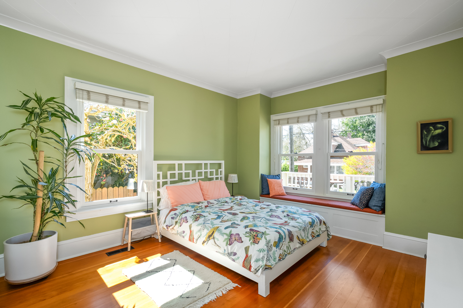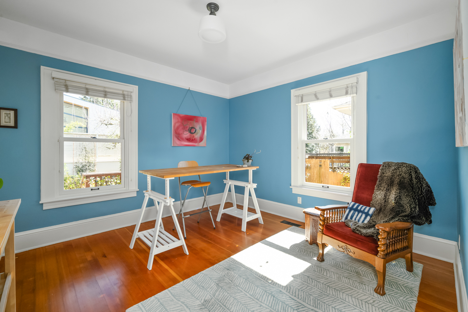 French doors in the foyer open to the main floors spacious living room with a leaded glass window nook, built-ins and gas fireplace. The kitchen is a sunny vintage delight with old school yellow subway tile backsplash and hex tile counters that connects to the light filled dining room with 2 back doors. The lush backyard is filled with intentional and intimate spaces, native and mature plantings, beautiful hardscaping, and a chicken playground. The two main floor bedrooms are roomy with huge windows including a built in window seat facing west in the front bedroom. The entire main floor has 9′ ceilings adding to the homes sense of airiness.