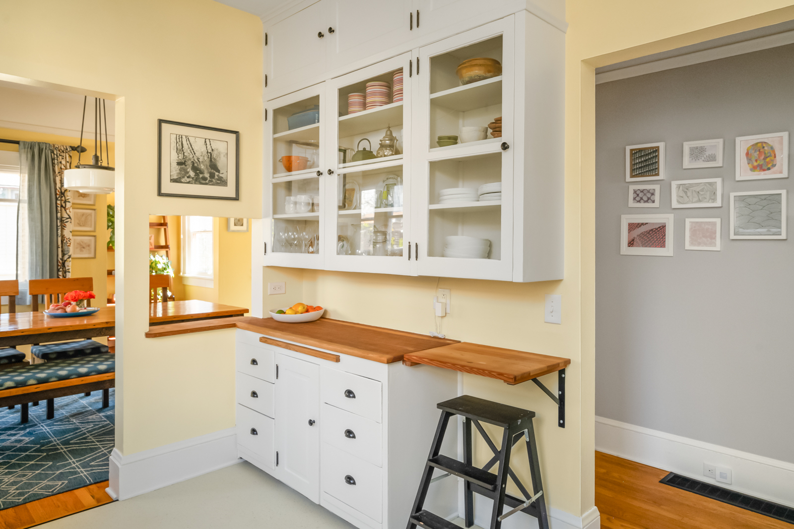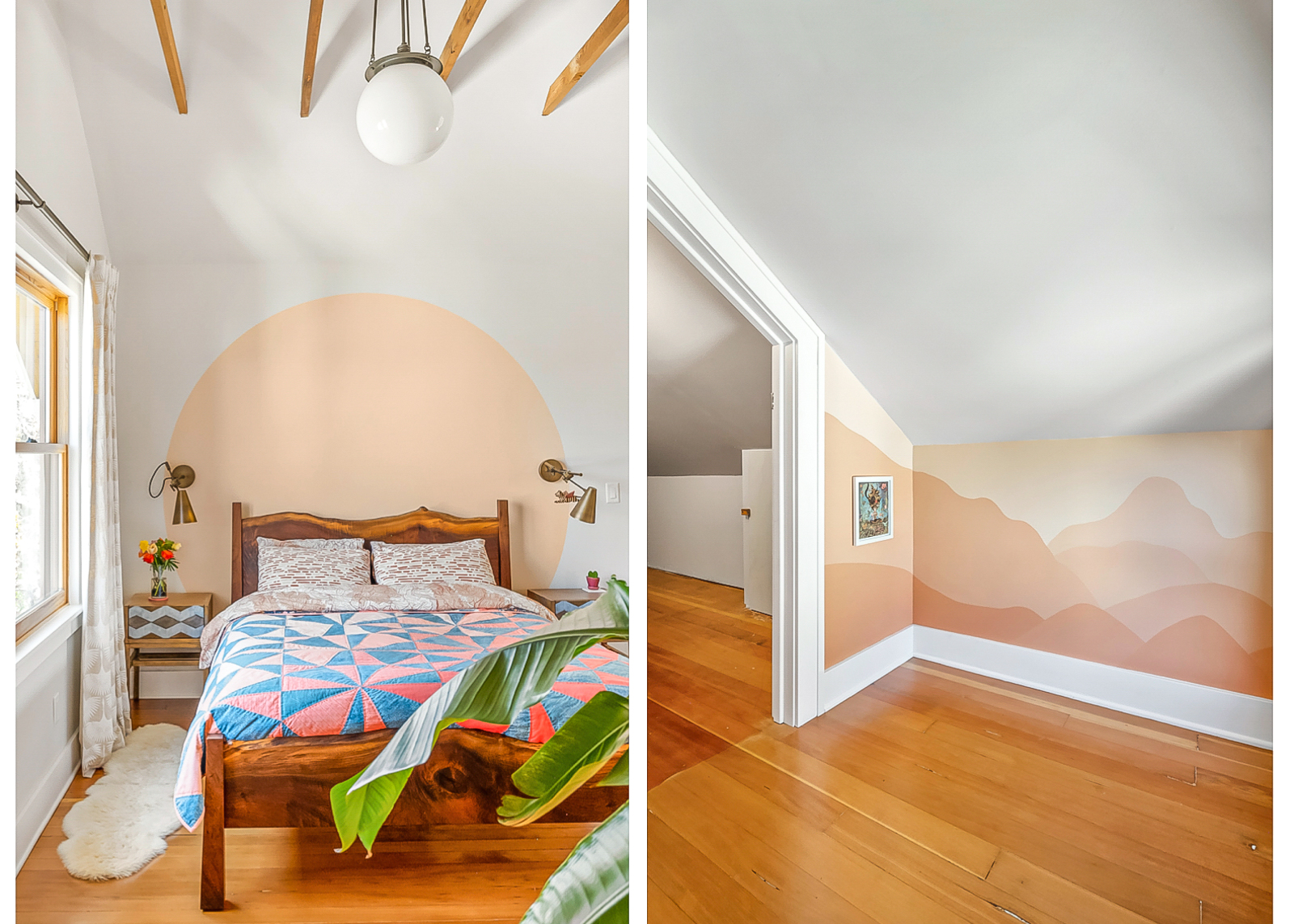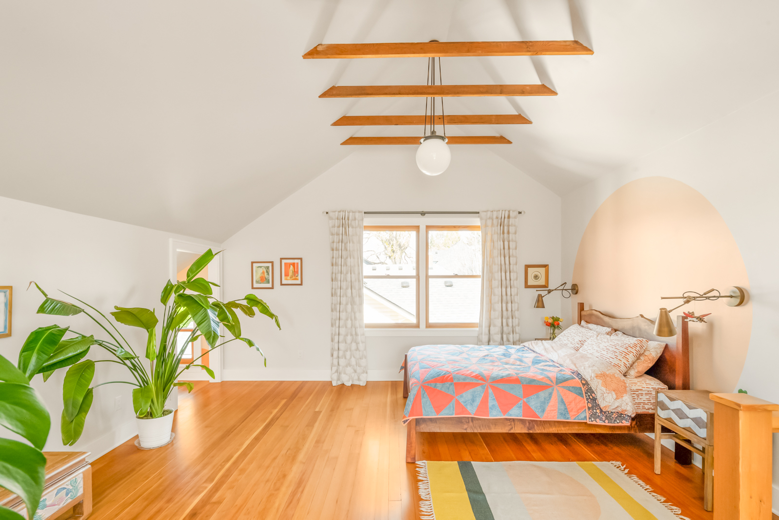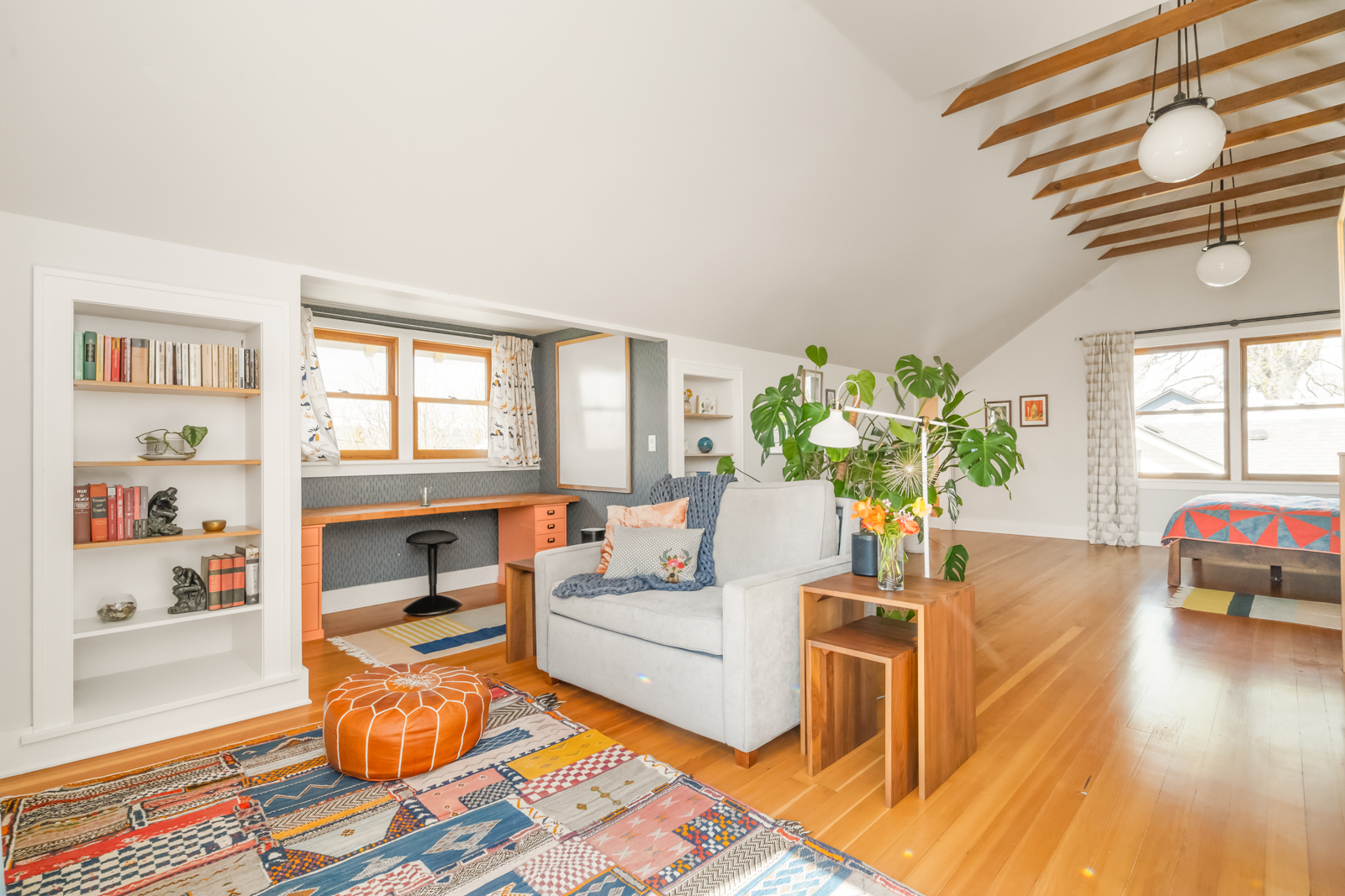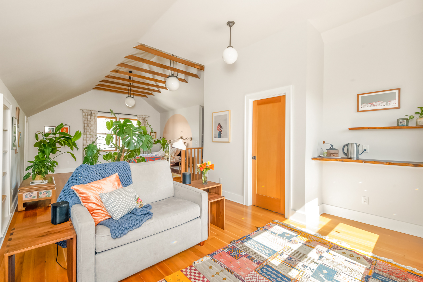French doors in the foyer open to the main floors spacious living room with a leaded glass window nook, built-ins and gas fireplace. The kitchen is a sunny vintage delight with old school yellow subway tile backsplash and hex tile counters that connects to the light filled dining room with 2 back doors. The lush backyard is filled with intentional and intimate spaces, native and mature plantings, beautiful hardscaping, and a chicken playground. The two main floor bedrooms are roomy with huge windows including a built in window seat facing west in the front bedroom. The entire main floor has 9′ ceilings adding to the homes sense of airiness.