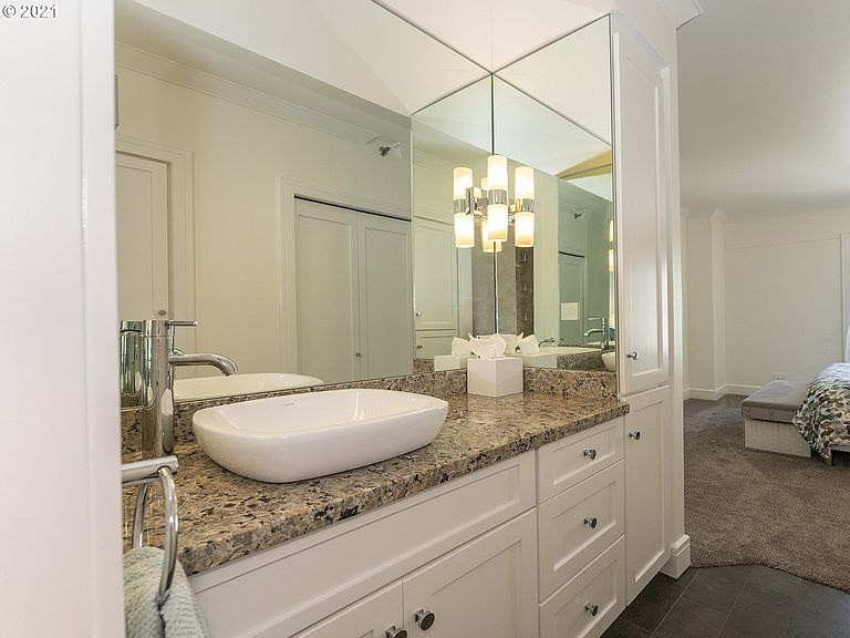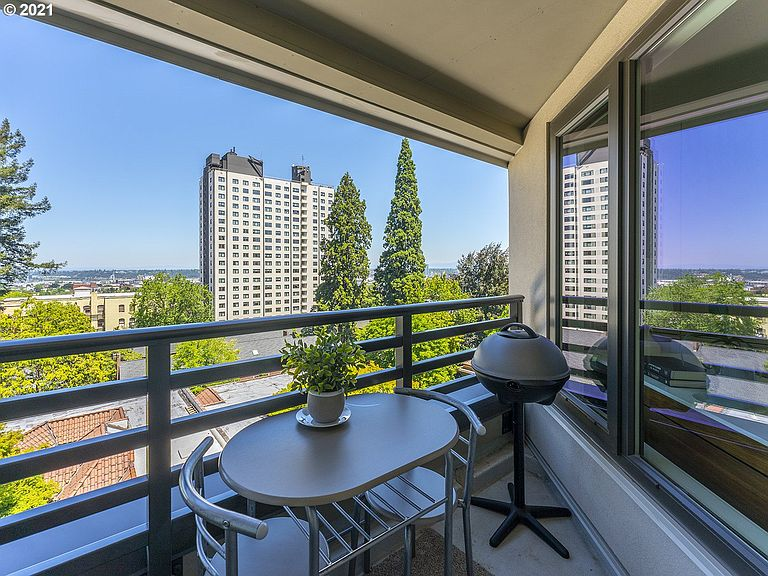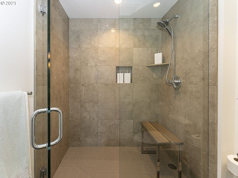 The primary suite boasts a newly updated, massive walk-in shower with glass doors, tile walls, a rain shower head, and a built-in bench. The balcony, connected to the living room and office on opposite sides of the condo, looks directly over the West Hills and offers panoramic views of downtown and the bridges.