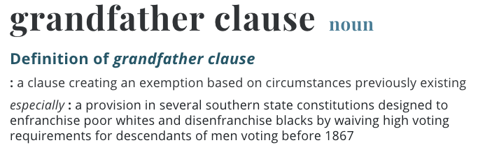 We use it all the time in Real Estate. The clause itself makes great sense. It’s a convenient shorthand way of conveying when an old rule continues to apply to an existing situation. But of course, it’s totally racist.