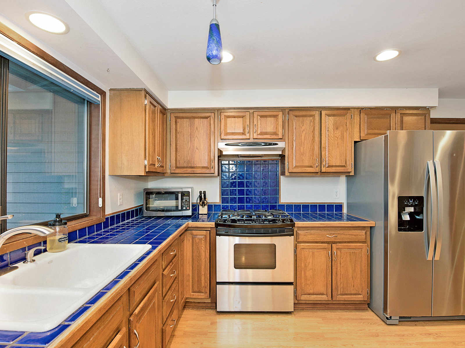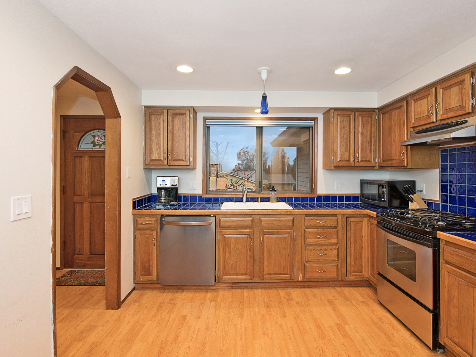 Welcome home to this classically appointed single level ranch on a hearty sized corner lot close to downtown Tigard and with great access to the freeways. Choose your own adventure upon entering… to your left is the oversized kitchen with vivid blue tile counters and a bevy of newer stainless appliances beyond which lies the cozy family room with woodburning fireplace.