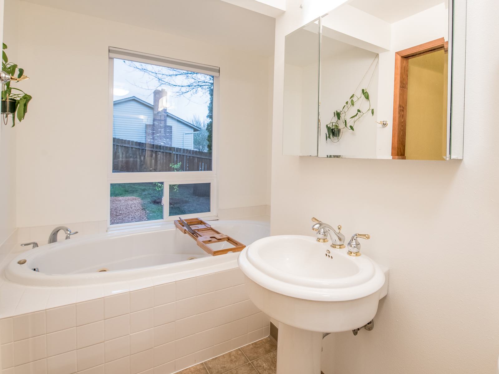 Or elect to follow the hall to the right where you will find the two baths and all three bedrooms including the master with it’s double closets and garden soaking tub.