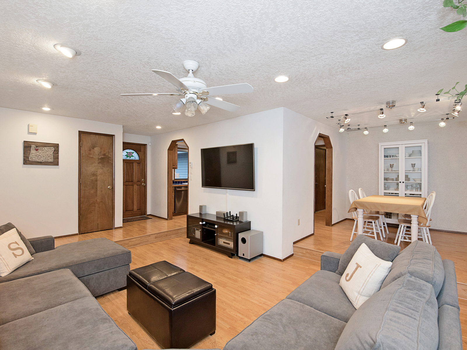 Front and center upon entering is the large sunken living room and adjacent dining room…