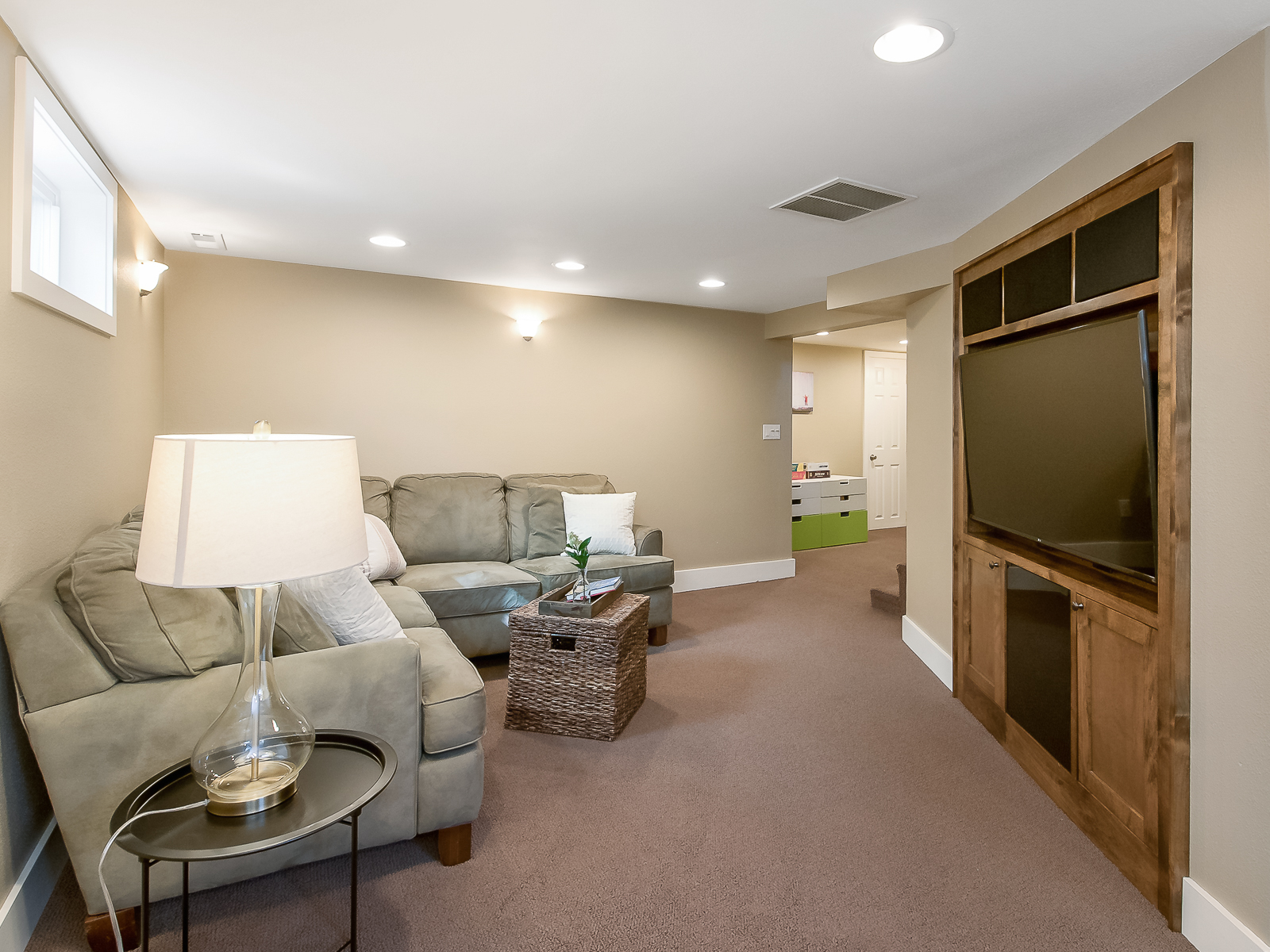 Snuggle in for movie time in the finished basement with spa-like bath.
