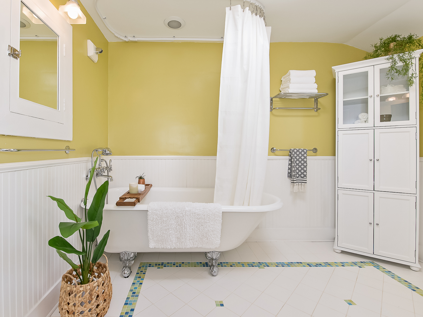 and a clawfoot tub offers opportunity to soak and relax in the cheery bathroom.