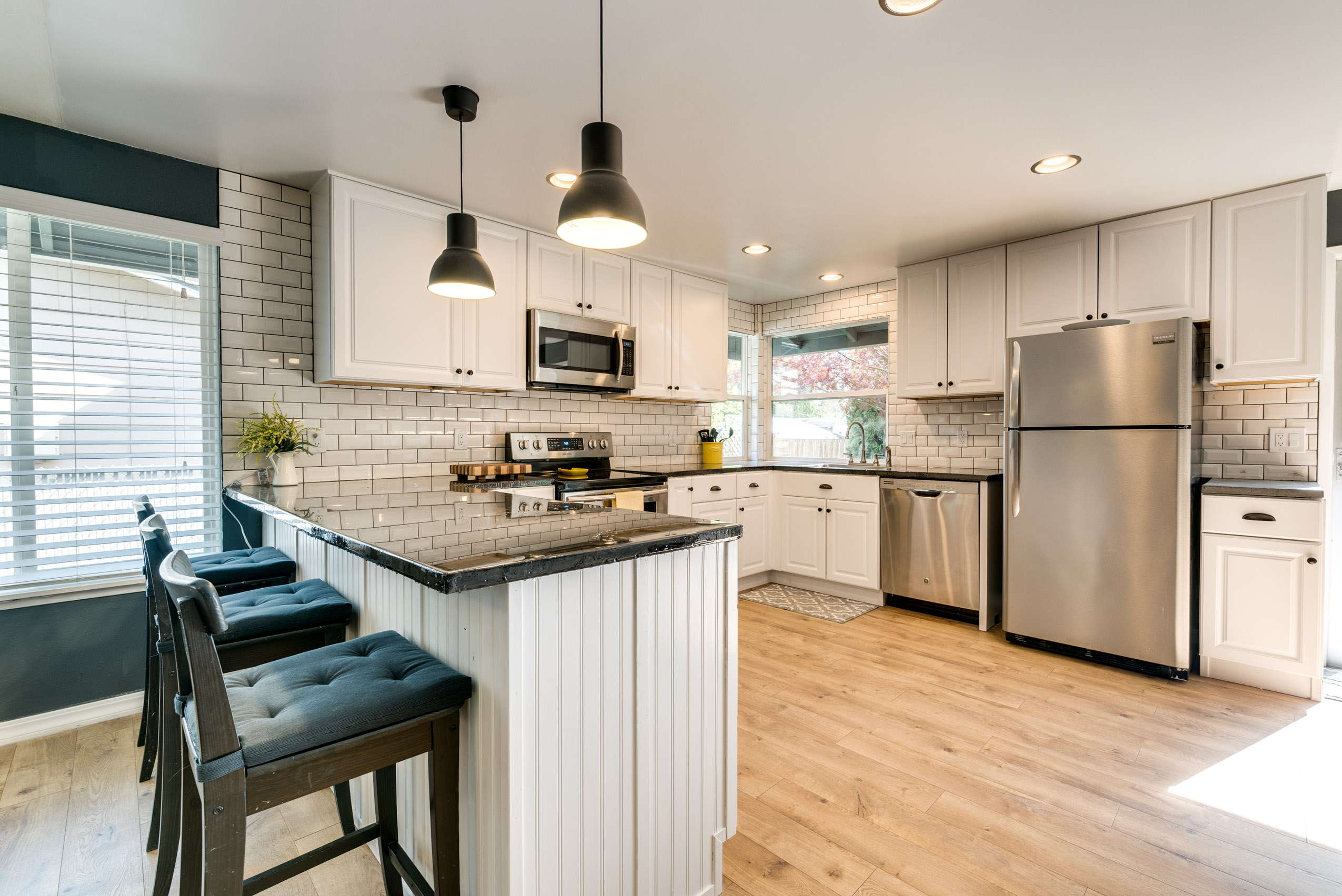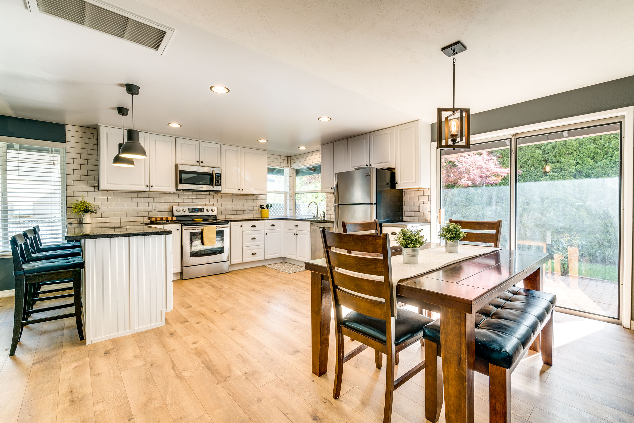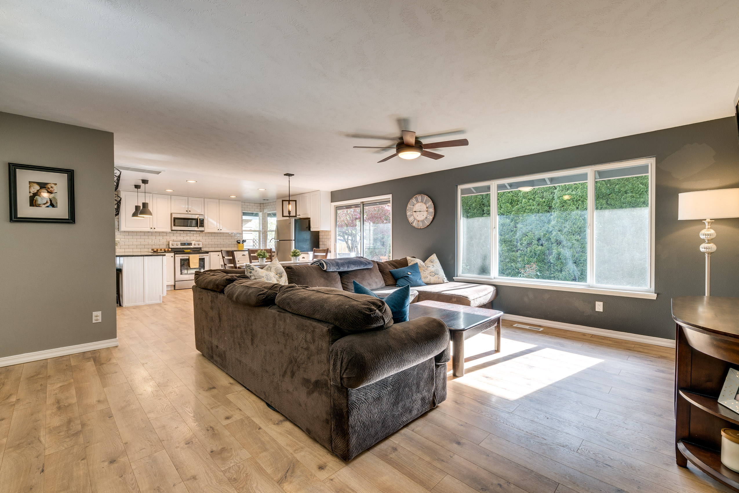 Tastefully updated, move in ready, one level home, with laminate flooring throughout. The open floor plan makes this home great for entertaining, and features separate living and family rooms. The updated kitchen with subway tile backsplash, concrete countertops, stainless steel appliance and can lighting is the perfect place to fulfill your foodie dreams. Updated master bedroom and bath features a walk-in closet—makes for the coziest place to end your day. The updated guest bath features a new vanity and tile floors. The back patio is ready for summer BBQ’s and the swing out front is ready to welcome you home. This home is a must see! First American home warranty included.