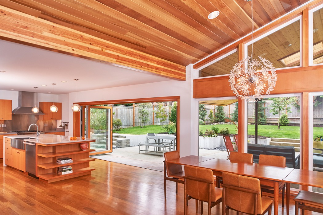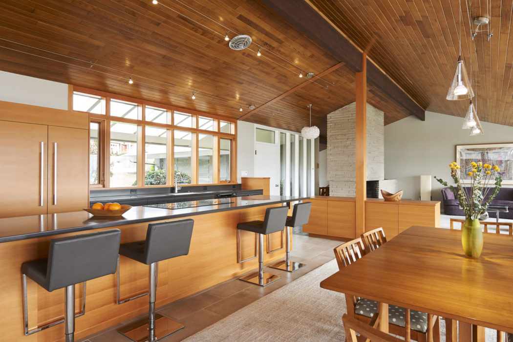 The early NW Contemporary style homes that were built in the 70s and 80s bring the outside in by featuring northwest wood ceilings and give a warm and rustic vibe if left unpainted. And often you’ll find skylights in these ceilings that provide moving paintings of light and clouds and color from above.