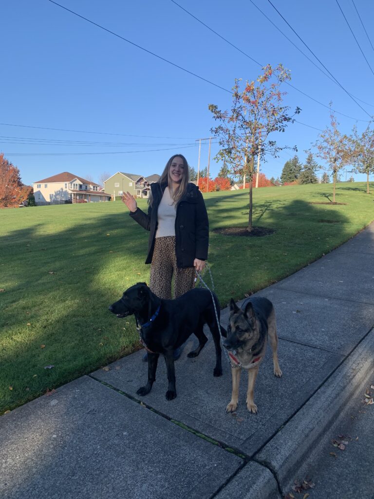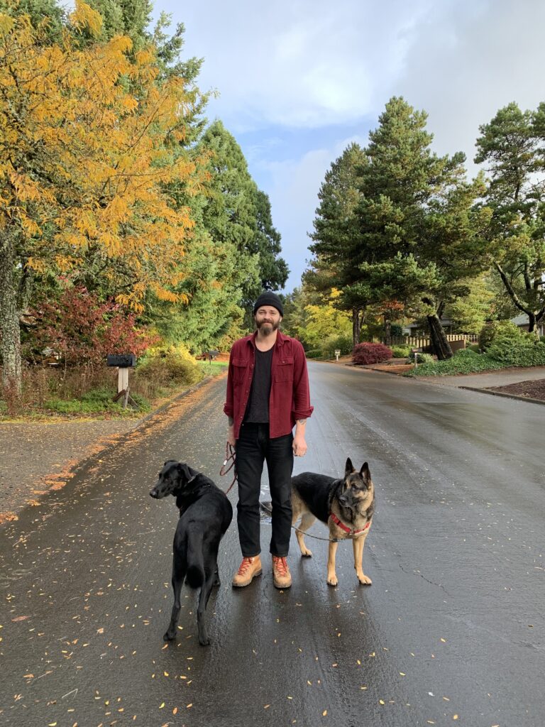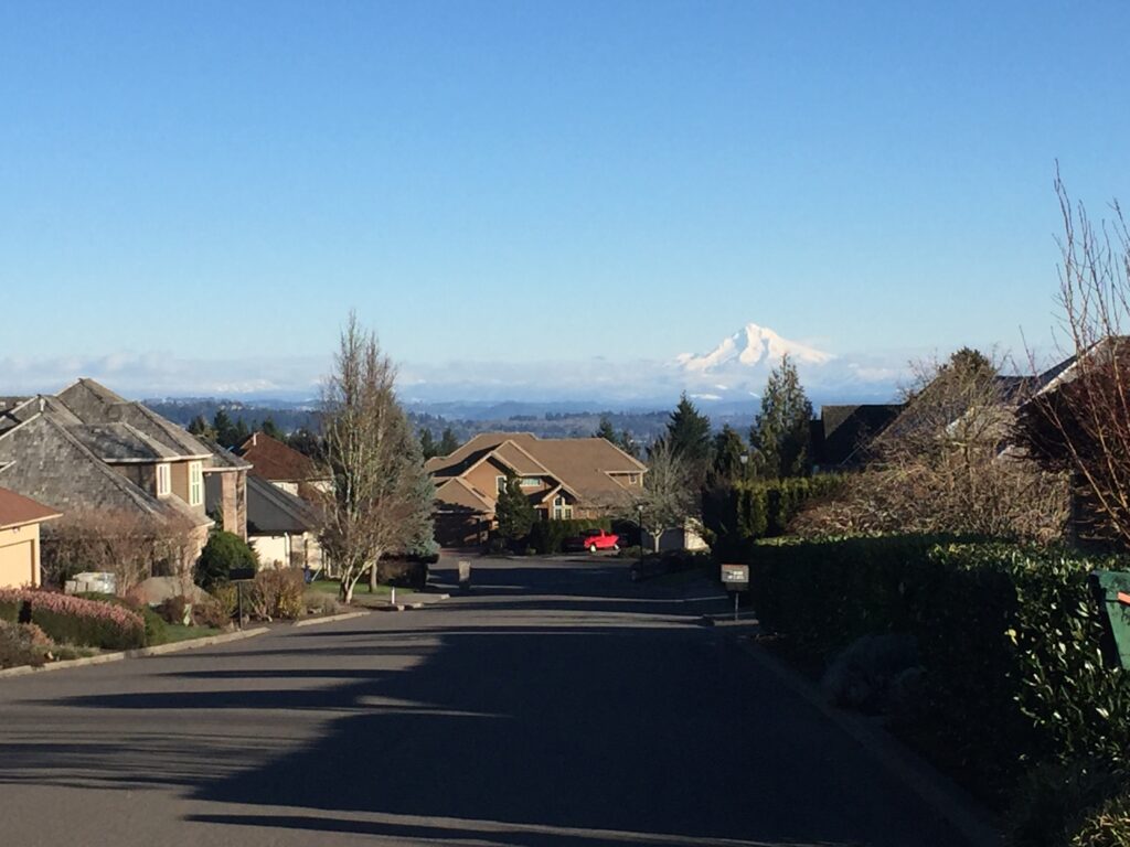 On the left is me walking next to a community green space with our dogs, Indy and Jackson. On the right is my husband, Mike on one of the many beautiful streets this fall, and below is my favorite view of Mt. Hood from High Tor Dr and SW 141st.
