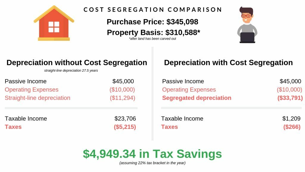 To calculate that, like operating expenses the depreciation is an expense against income. With the $33,791 in depreciation captured through cost segregation, Joe was able to claim that total as a loss. Thus reducing his total taxable income even further to $1,209 versus $23,706.