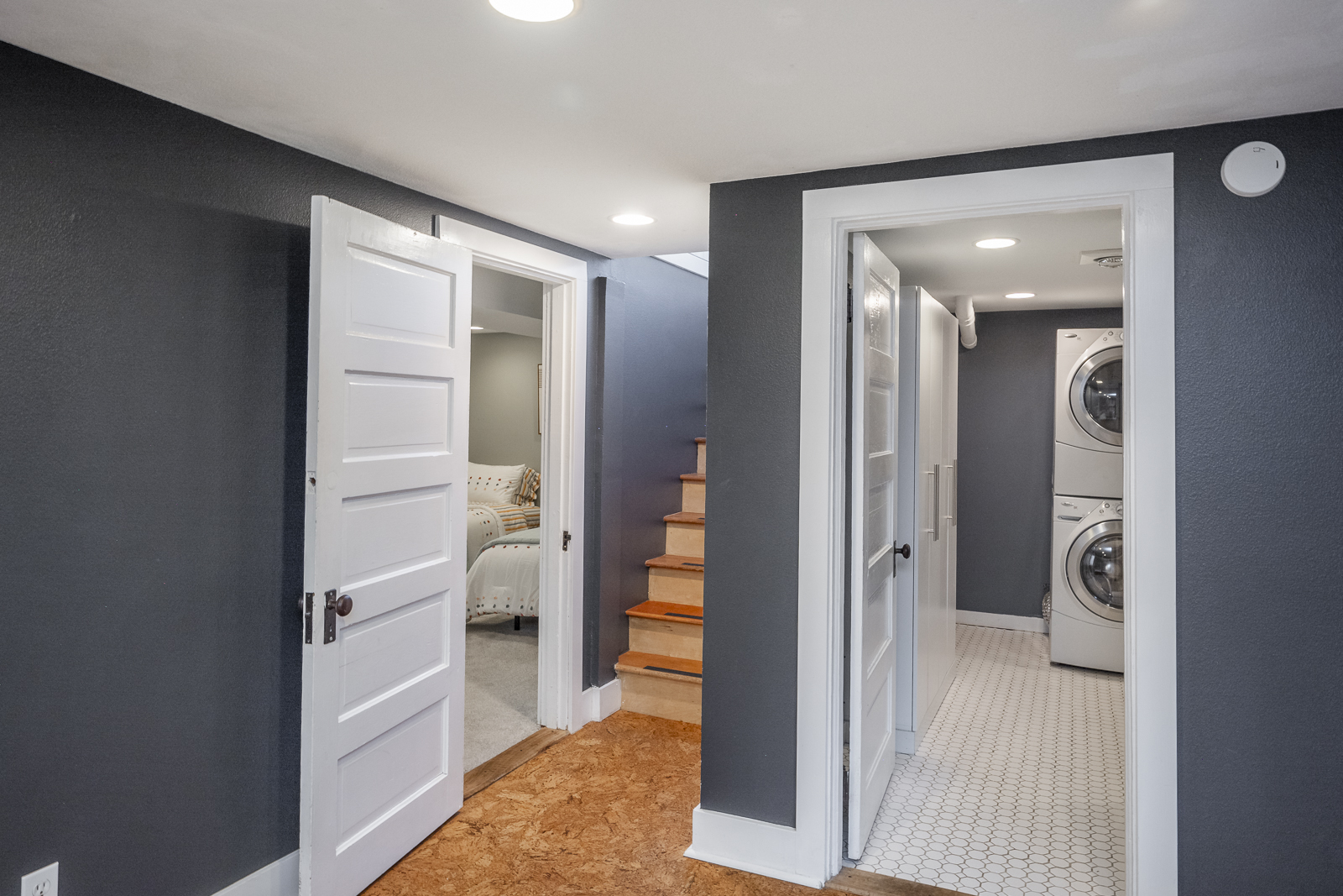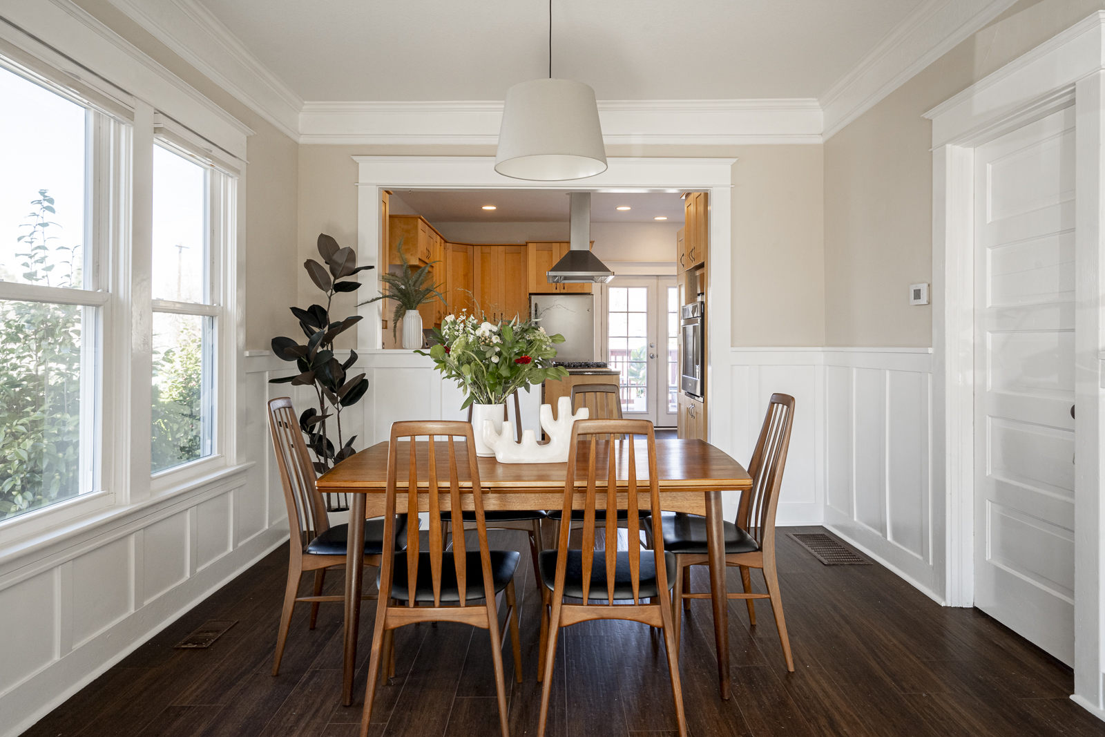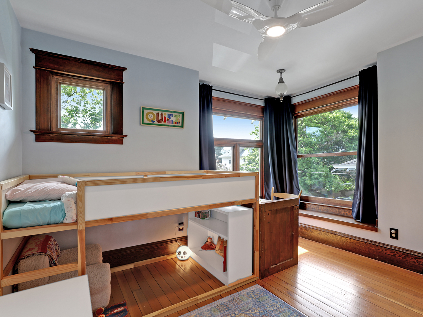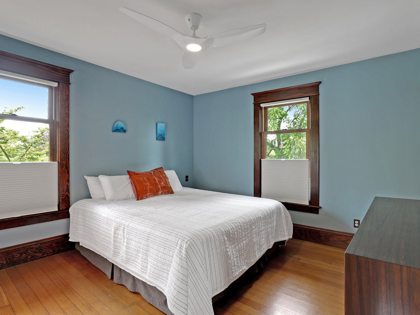 The spacious living room opens to a comfortable dining room and an updated kitchen, featuring a back door that leads outdoors to a gated area. Upstairs, you’ll find two spacious bedrooms, each with a walk-in closet, and a beautifully updated bathroom featuring a jetted tub, era-appropriate finishes, and a convenient washer and dryer.