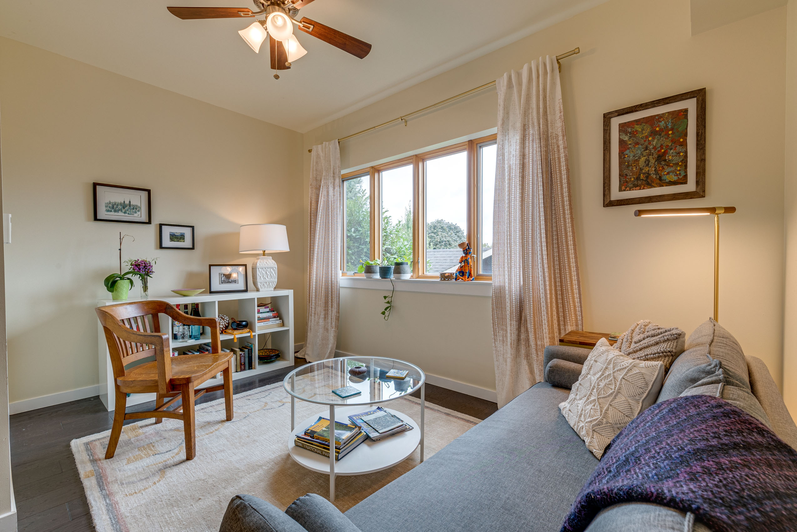 Through the kitchen, you’ll find yourself in a spacious den with a big window and bookshelves.
