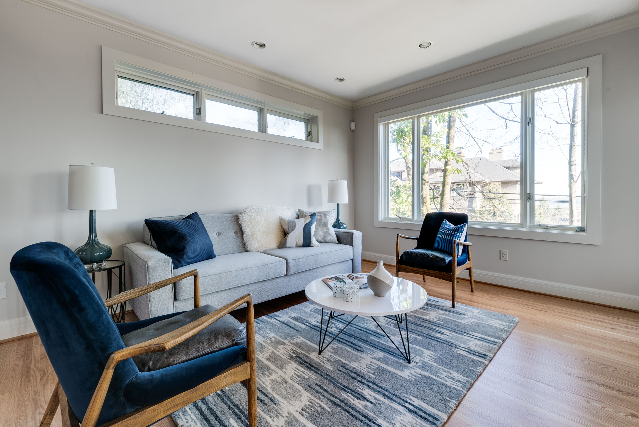 The perfectly laid out living room has a gas fireplace flanked by a large window and slider that allows light to flood into the space.