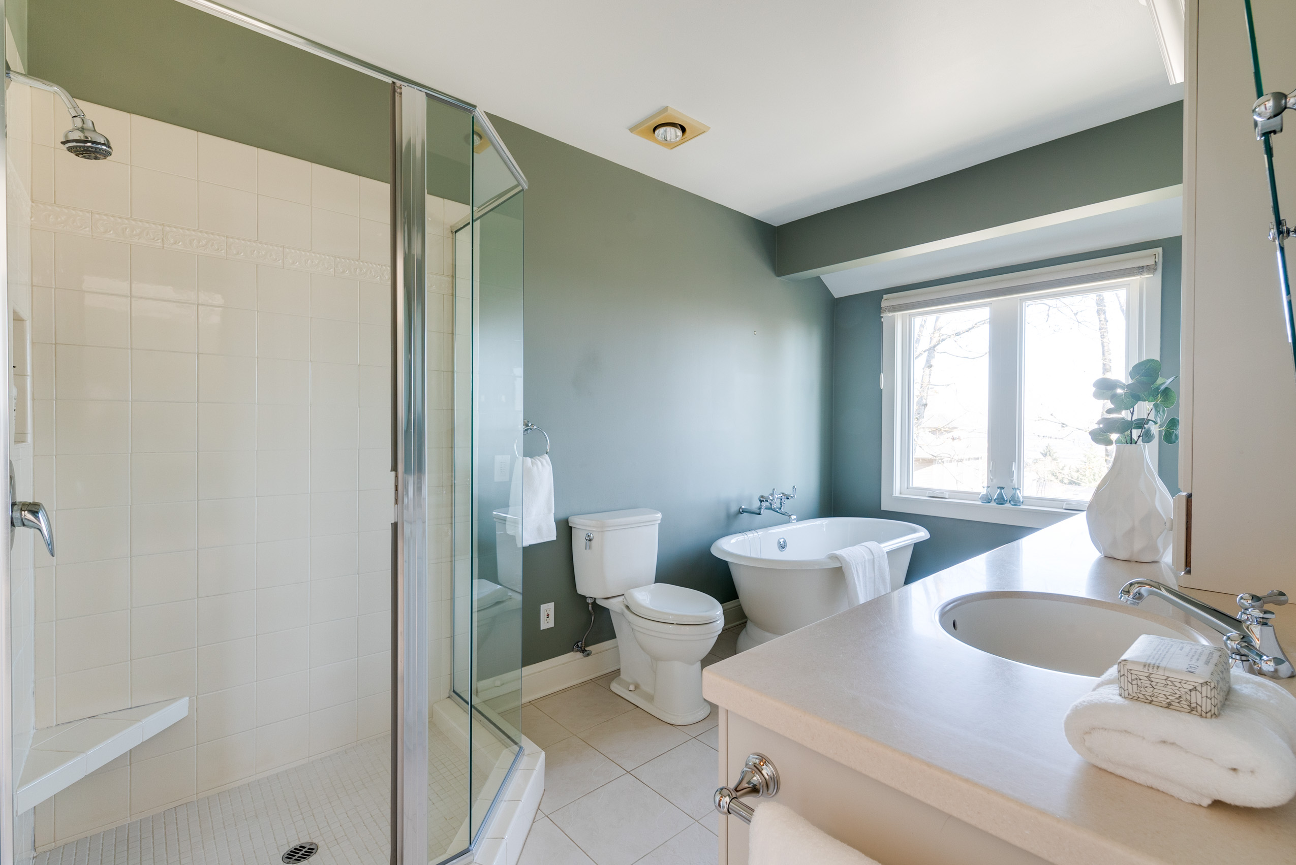 Primary en suite bathroom has a shower and soaking tub.