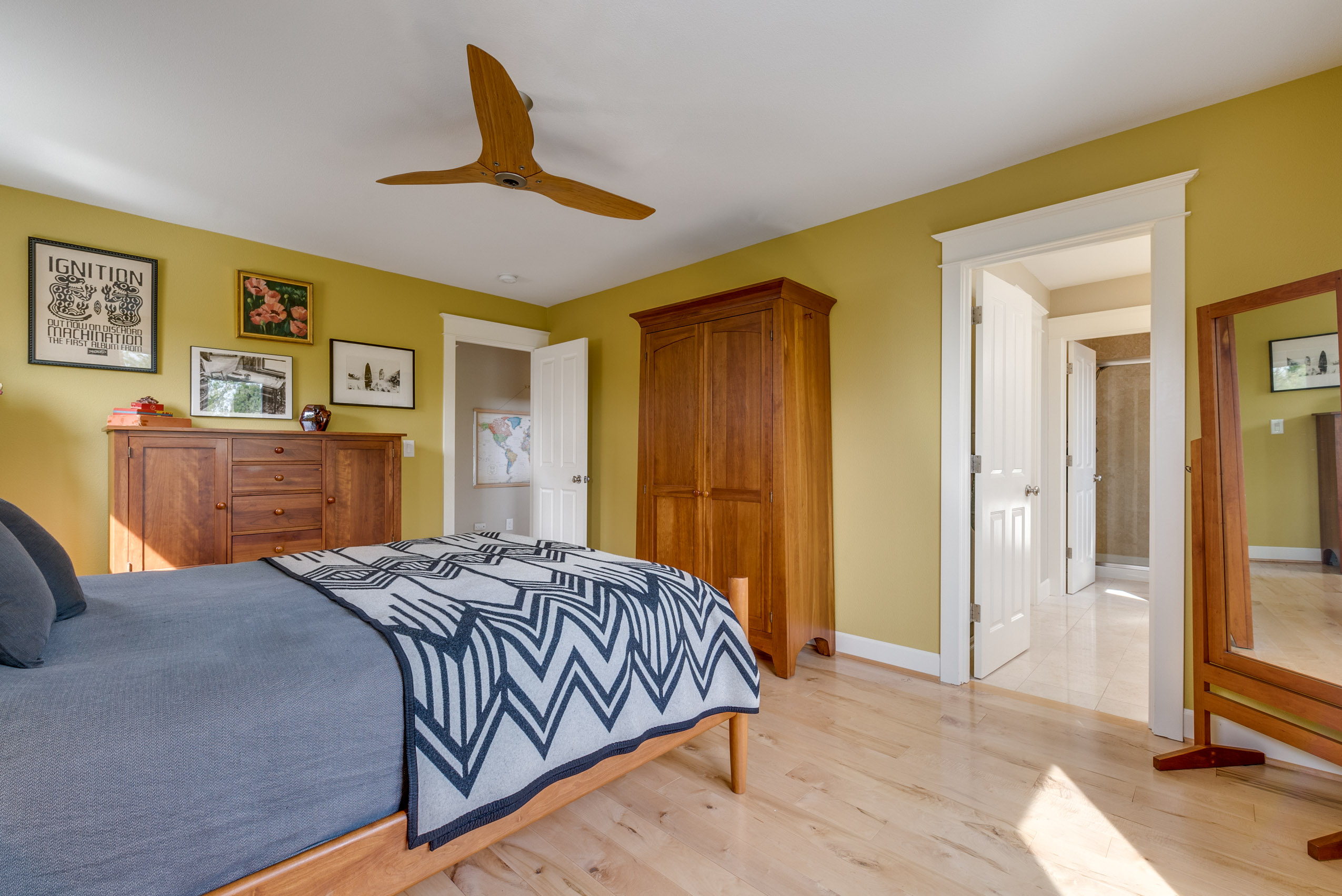 The layout and flow throughout the home is absolutely ideal for a home of this size. Through the hall, you’ll find three bedrooms filled with natural light and ample closets. Also, a roomy bathroom with double sinks and stylish updates.