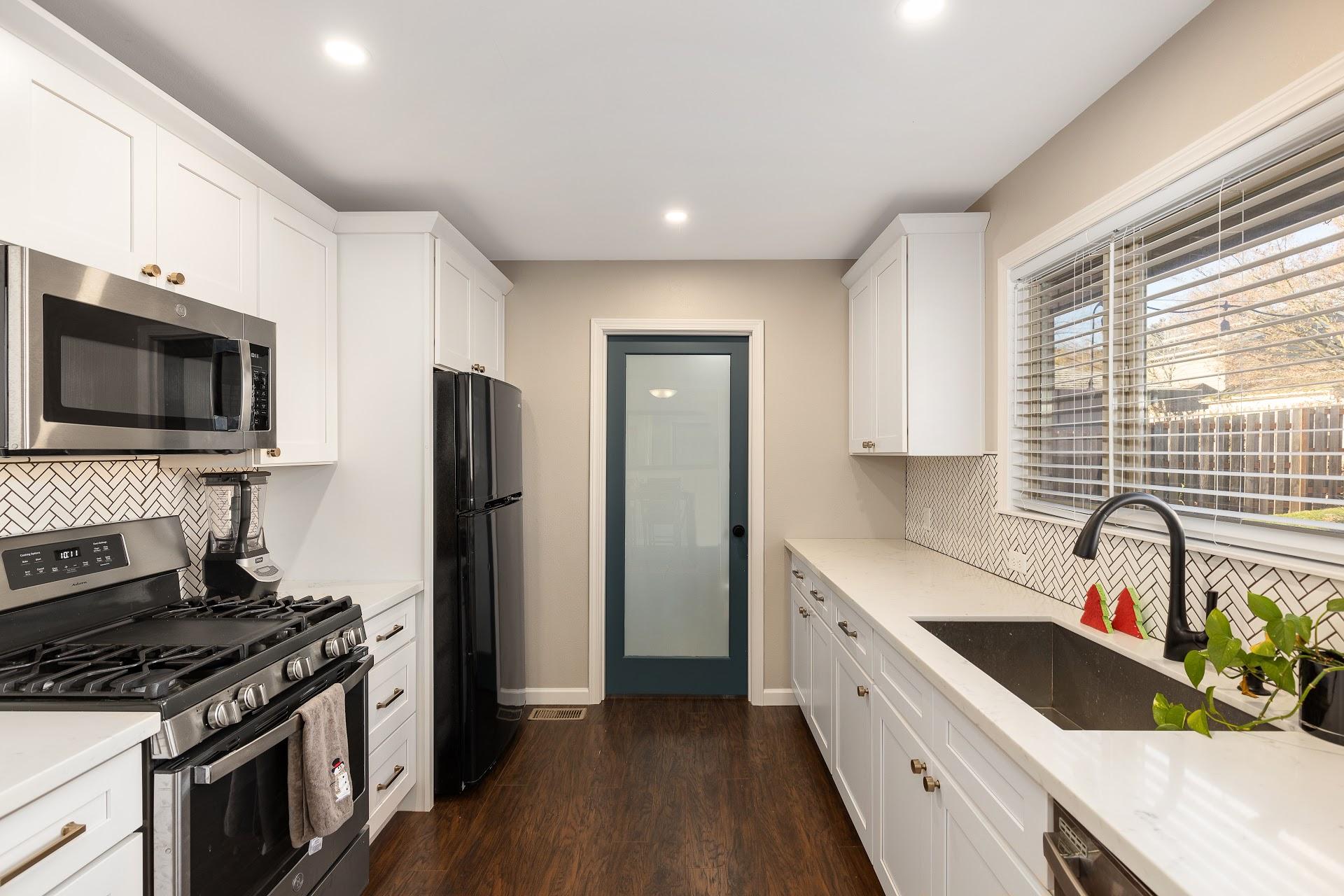 The layout and flow throughout the home is absolutely ideal for a home of this size. Through the hall, you’ll find three bedrooms filled with natural light and ample closets. Also, a roomy bathroom with double sinks and stylish updates.