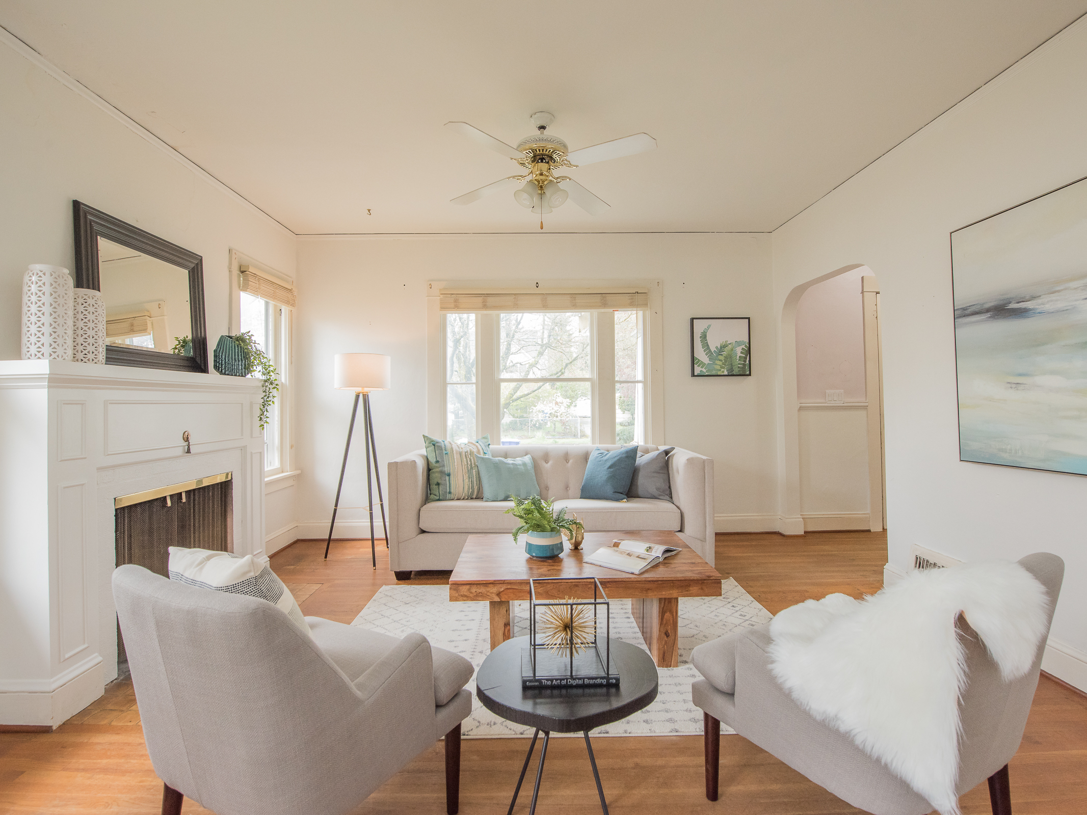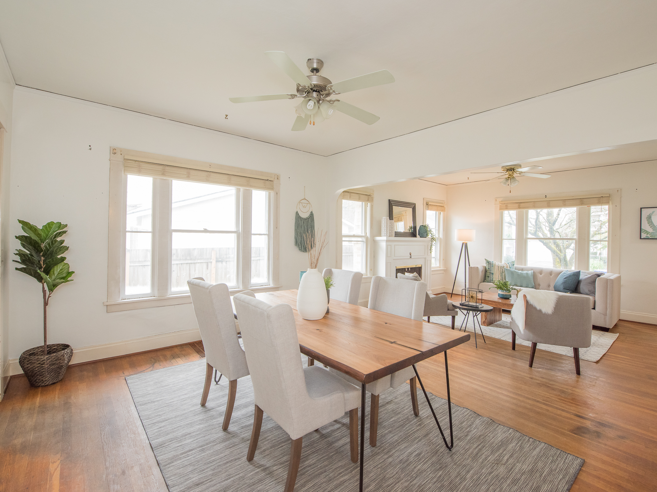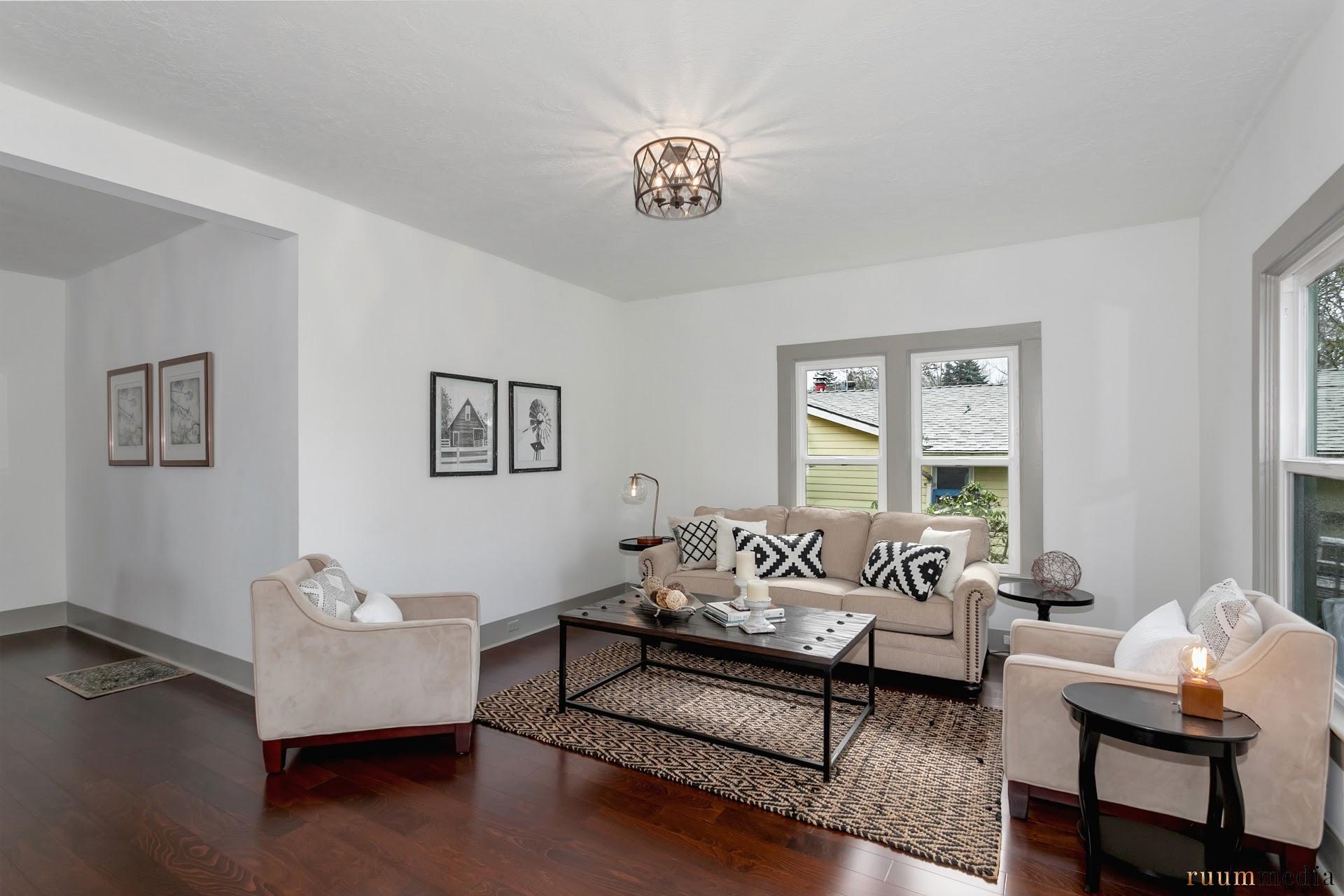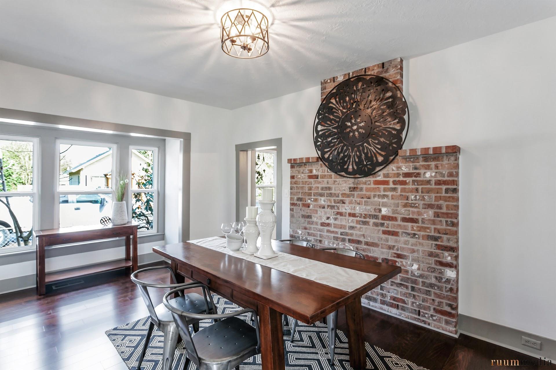 The dining room was centered in what I would consider the walkway from the front door. We removed the chandelier, added a flush mount modern light fixture, and moved the dining area in front of the window which overlooks Rocky Butte. Under this carpet we discovered white oak hardwood floors. With some sanding and a few coats of polyurethane, they turned out better than new. What you see here is the natural color of the wood. No stain needed.