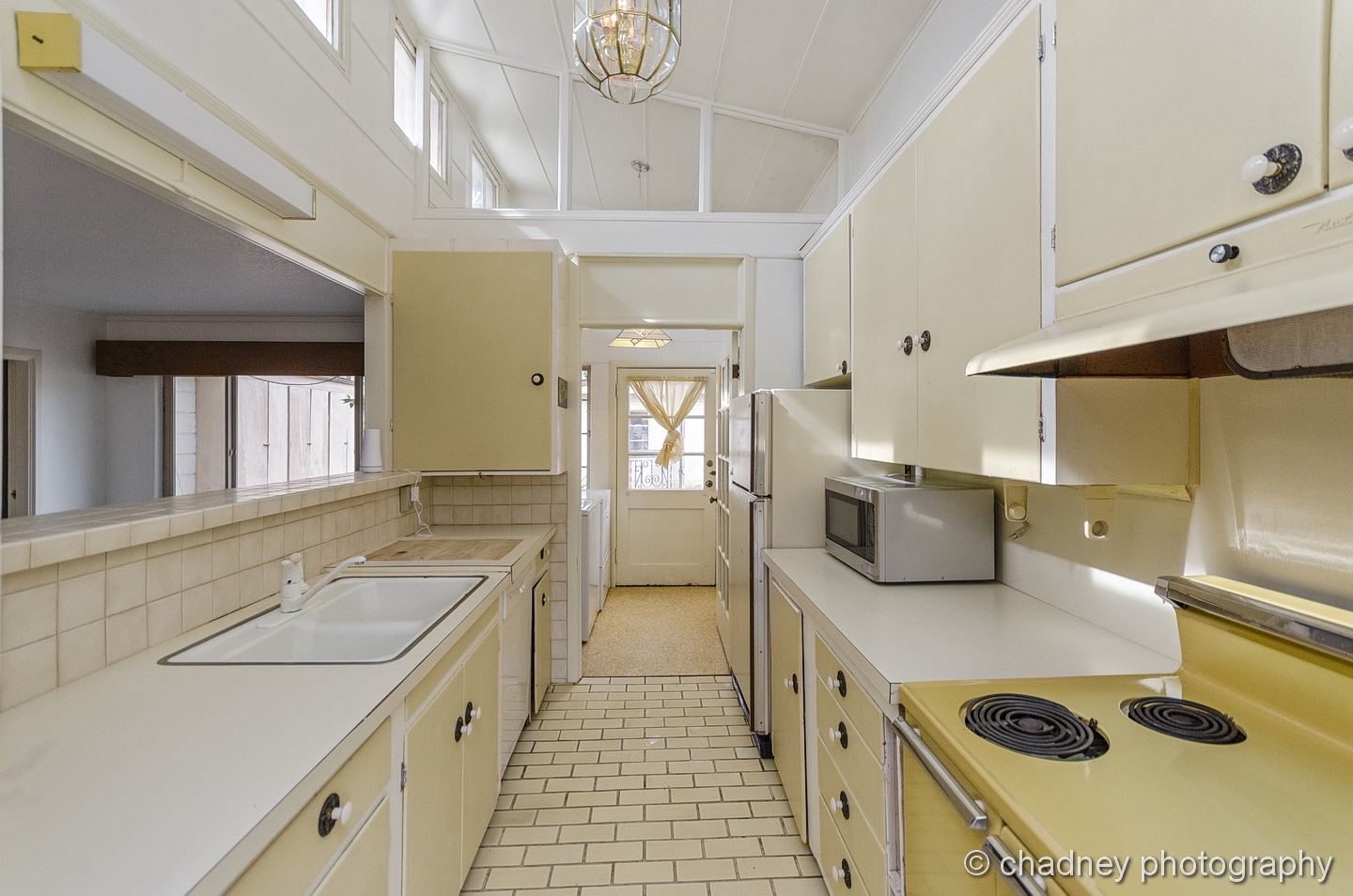 And here is what we did. Starting from the outside, we knew the roof needed to be replaced, but weren’t anticipating having to remove three layers first. We replaced the roof, and removed the large drop arm awnings and dated barred glass door. Any time I see bars over window and door and large awnings, I always remove them. This is a safe neighborhood, and there was a great solid wood door behind those bars which you really couldn’t see. The awnings, while they kept out some of the heat, they also kept out light which now comes shining through these great midcentury windows.