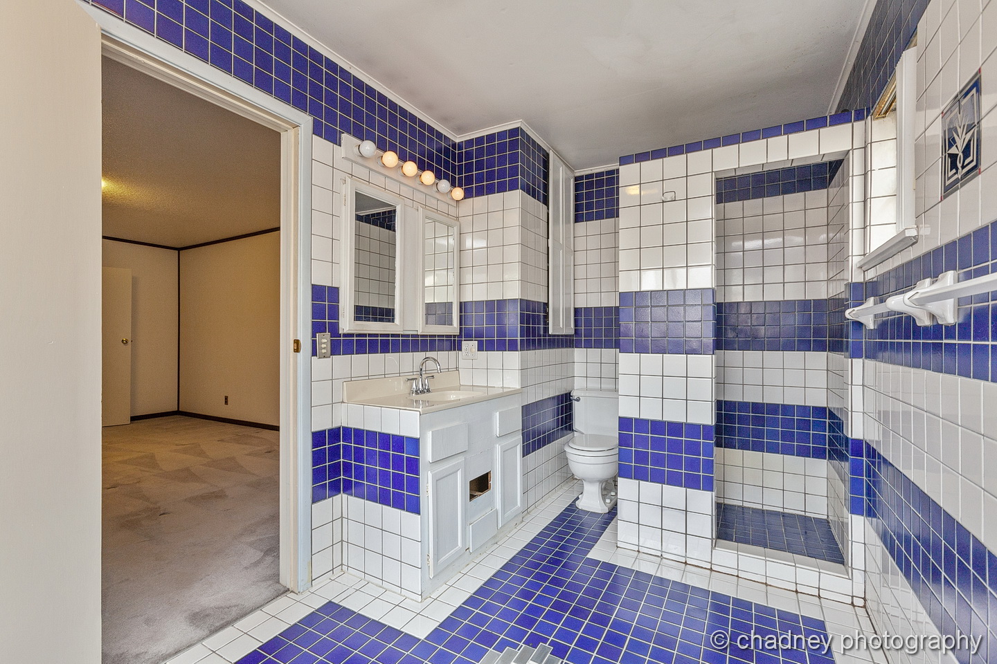 The bathroom layout worked, but it felt small and was dark. We brightened it up with white walls and wall tile, added a large mirror and some stylish, bold blue floor tile.