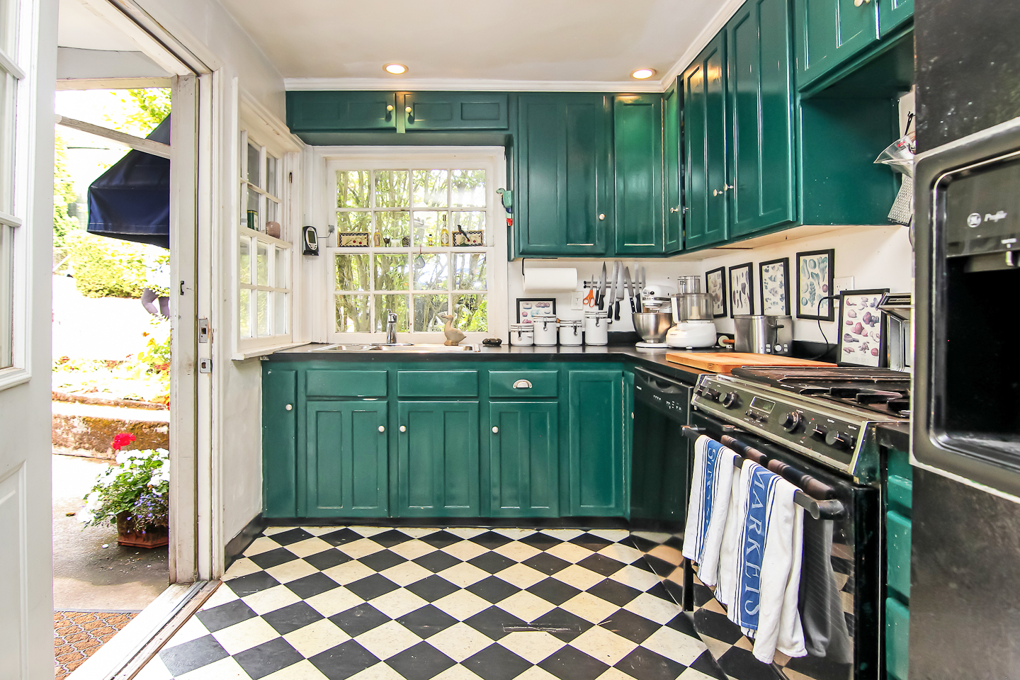 Oh this kitchen…while cute (and who can resist that horse rocker), it lacked functional space. The refrigerator was in front of the sliding glass door, and kitchen overall needed more storage. We swapped the fridge location and the coffee bar (and built a smaller one), and made room for a new large pantry. We kept and restored the solid wood cabinets and added butcher block counter tops to warm it up. With new appliances and the benefit of a dishwasher, this kitchen functions much better.