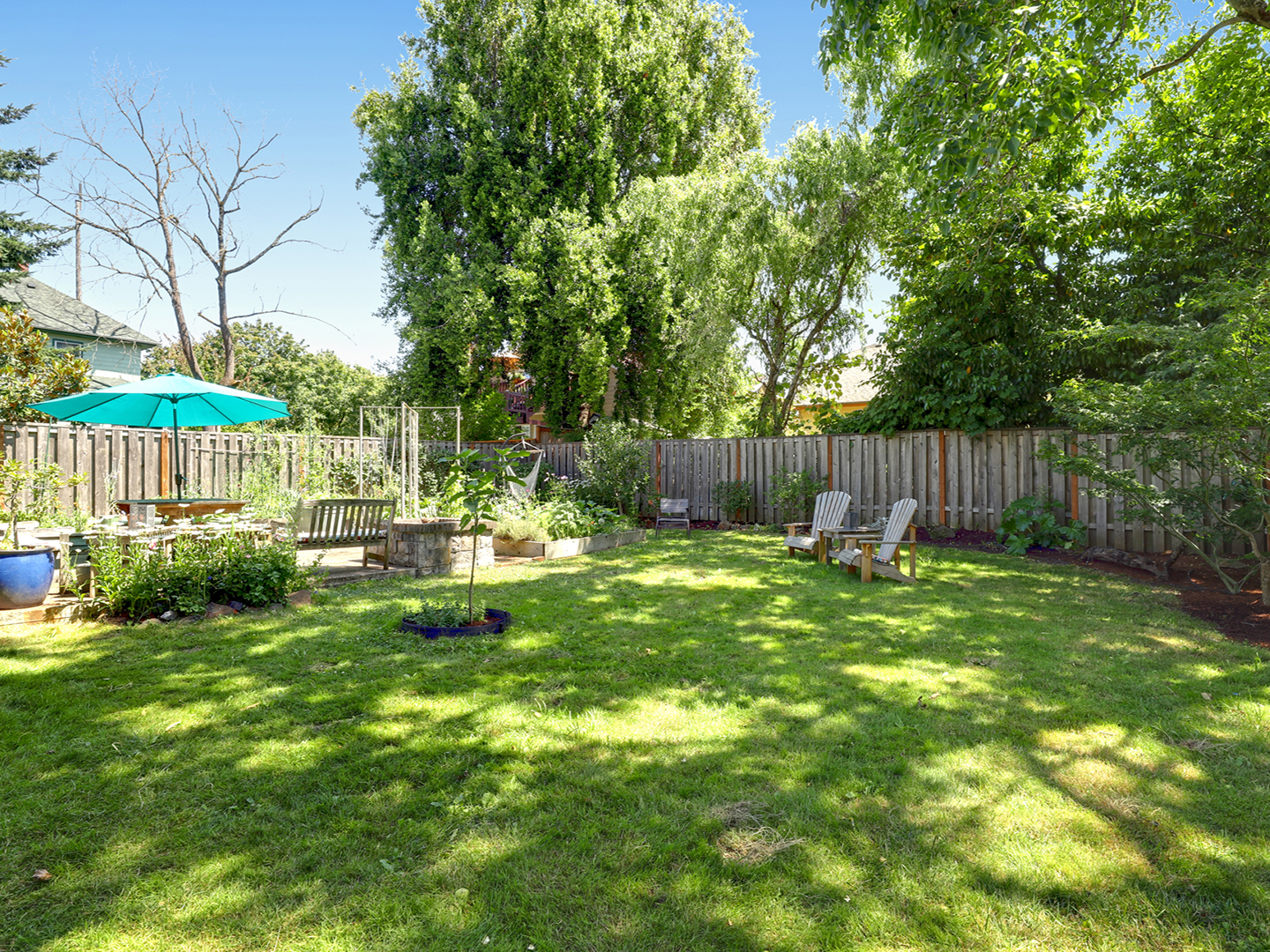 - A spacious fenced backyard with reseeded lawn, roses and perennial outer beds.