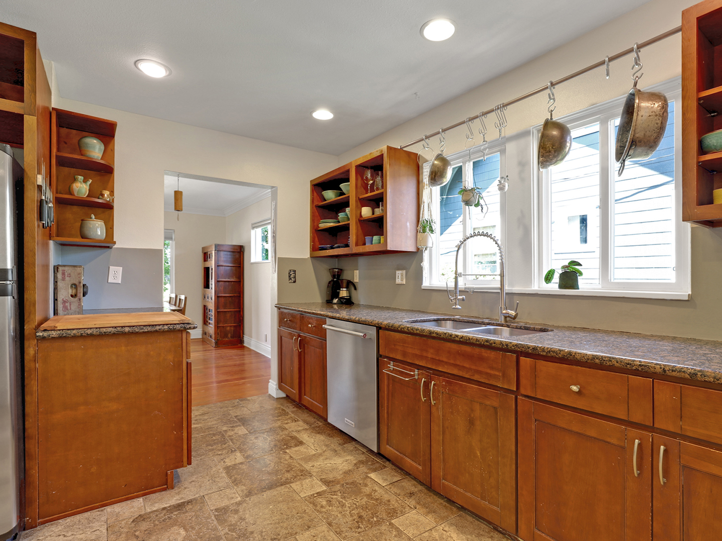 - Two-bedroom, one-bathroom bungalow with bonus spaces, built-ins, and a large open yard