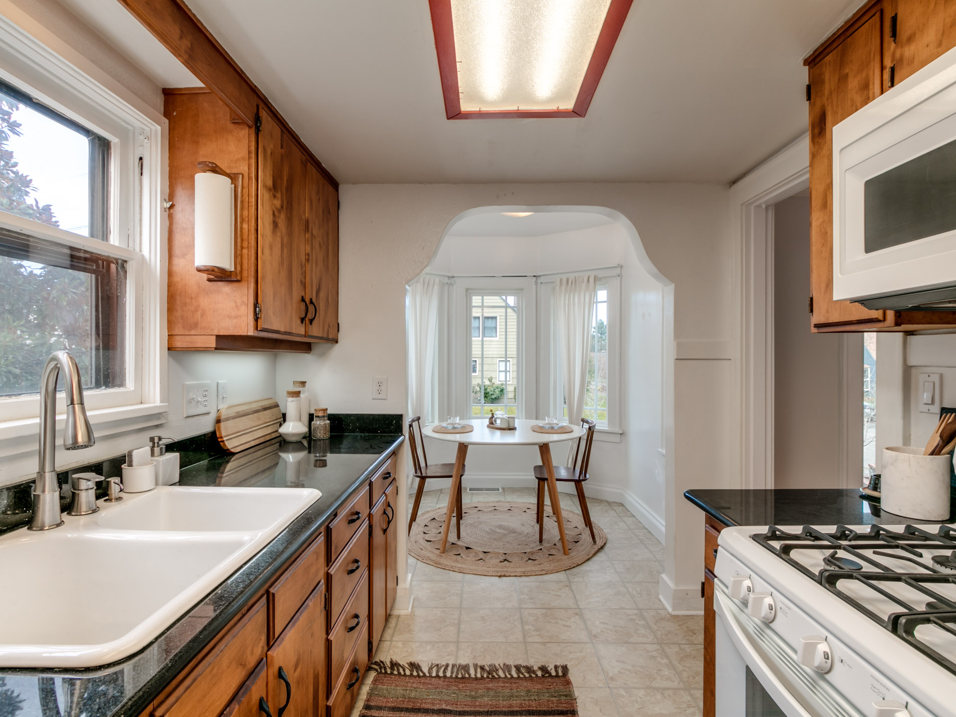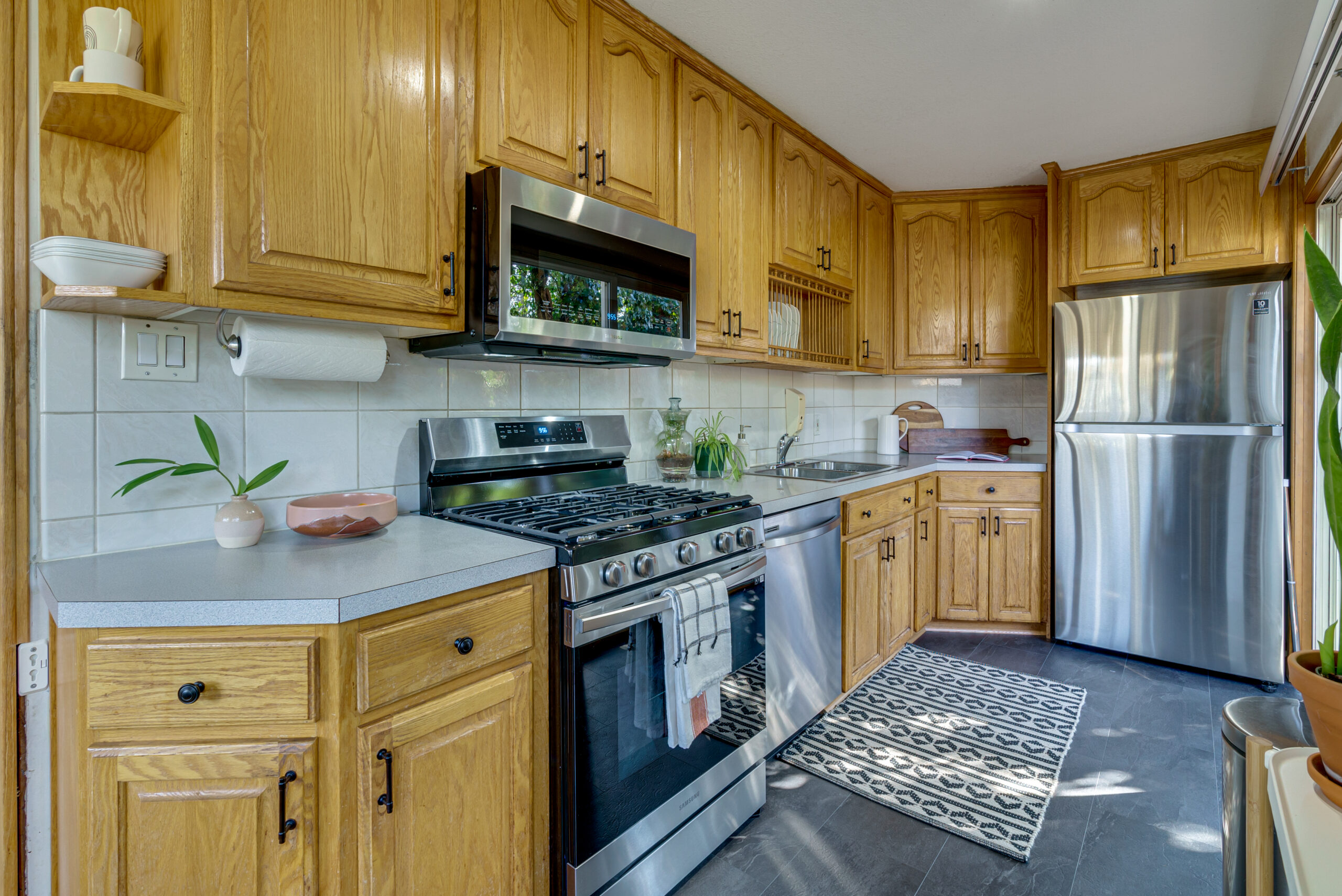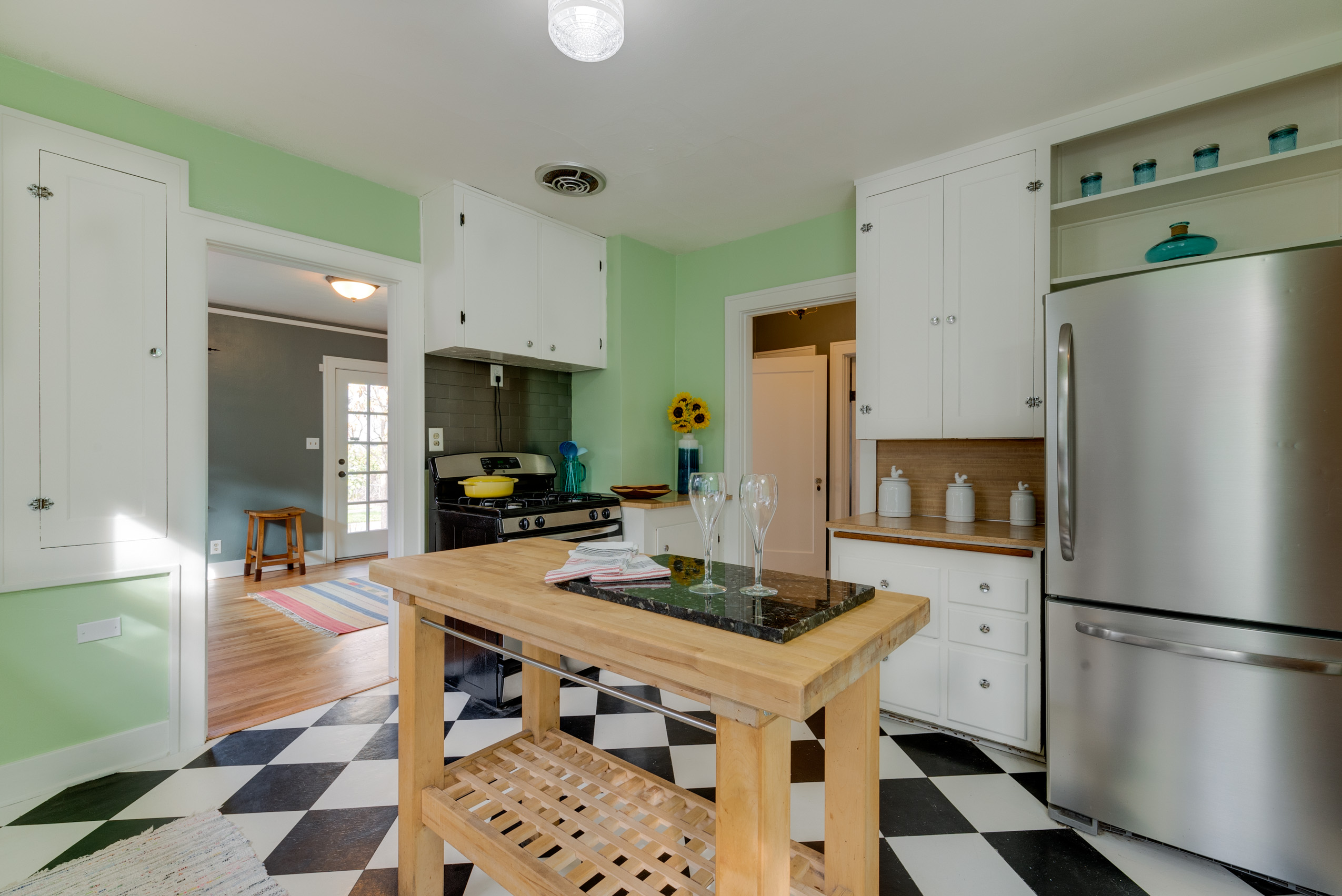A large sliding glass door from the porch provides sheltered entry to the rear tiled foyer, laundry space, full bathroom and short hallway to the kitchen. The big kitchen is at the heart of the house and links the living room and dining area into a unified whole for easy entertaining and comfortable living. The large island is sure to be the center of conversation and connection. Granite countertops and newer cabinets complement the stainless appliances, while sink windows brings light and air. There is a south-facing bedroom with a large closet off the kitchen for one-level living, or for use a reading and media room.