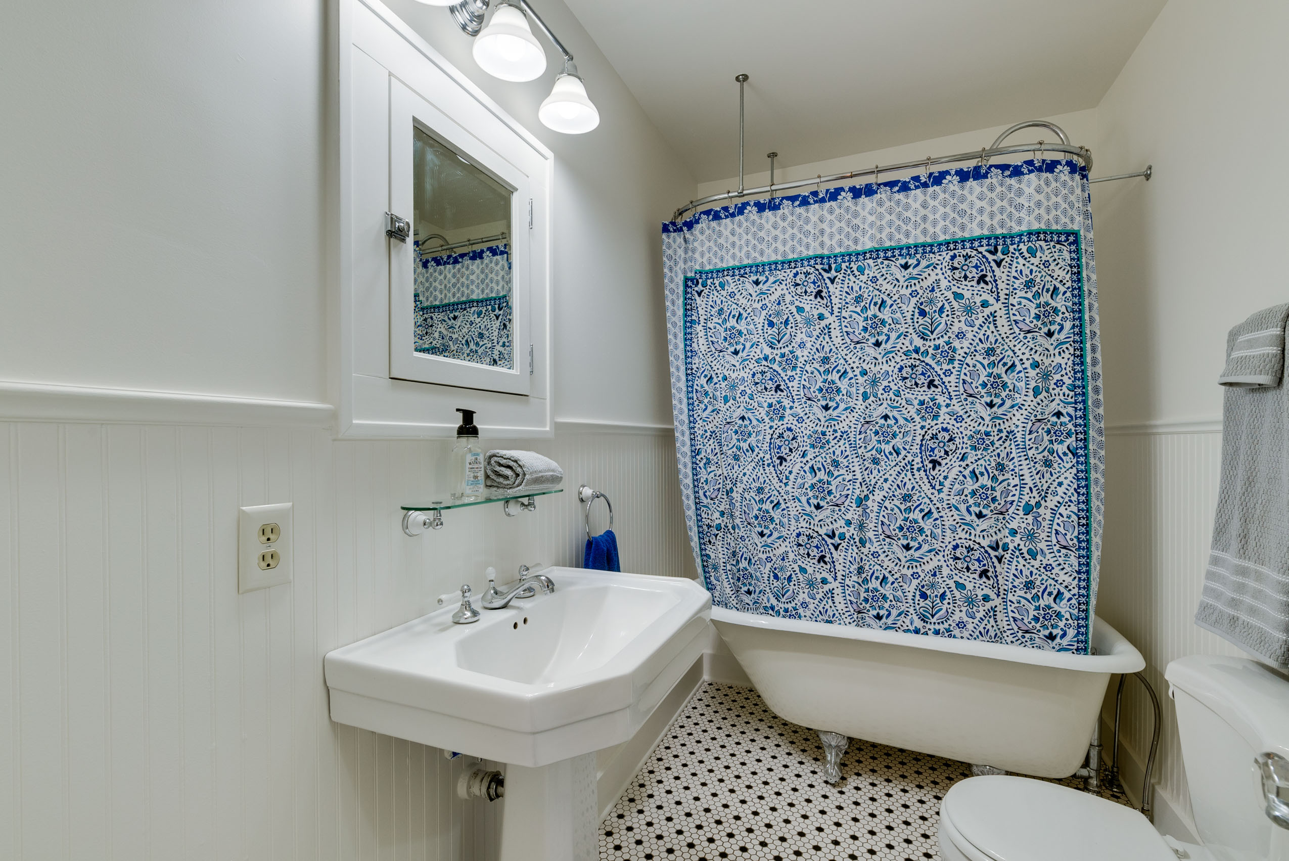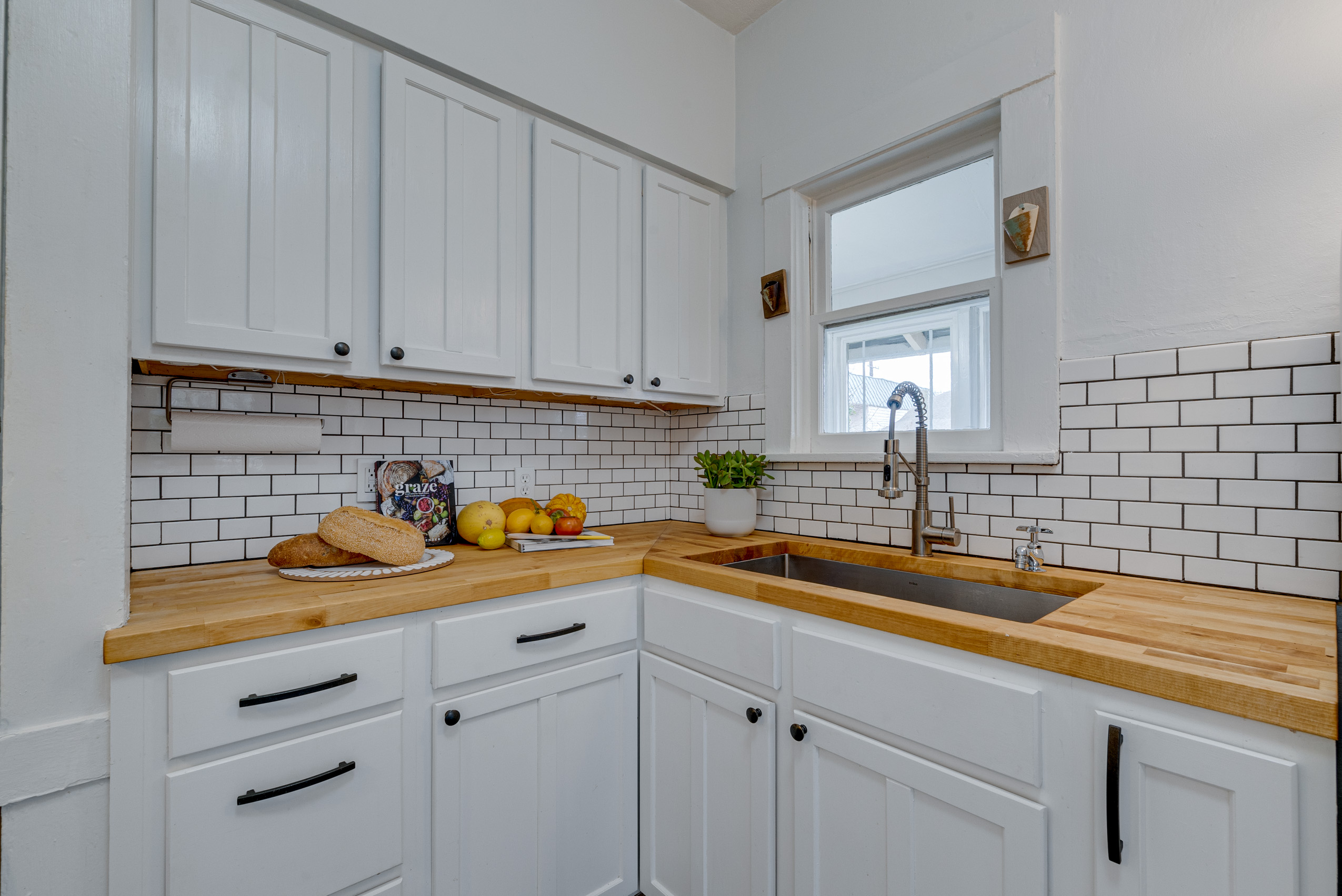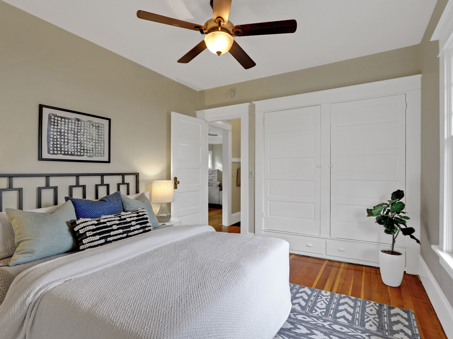 A large sliding glass door from the porch provides sheltered entry to the rear tiled foyer, laundry space, full bathroom and short hallway to the kitchen. The big kitchen is at the heart of the house and links the living room and dining area into a unified whole for easy entertaining and comfortable living. The large island is sure to be the center of conversation and connection. Granite countertops and newer cabinets complement the stainless appliances, while sink windows brings light and air. There is a south-facing bedroom with a large closet off the kitchen for one-level living, or for use a reading and media room.