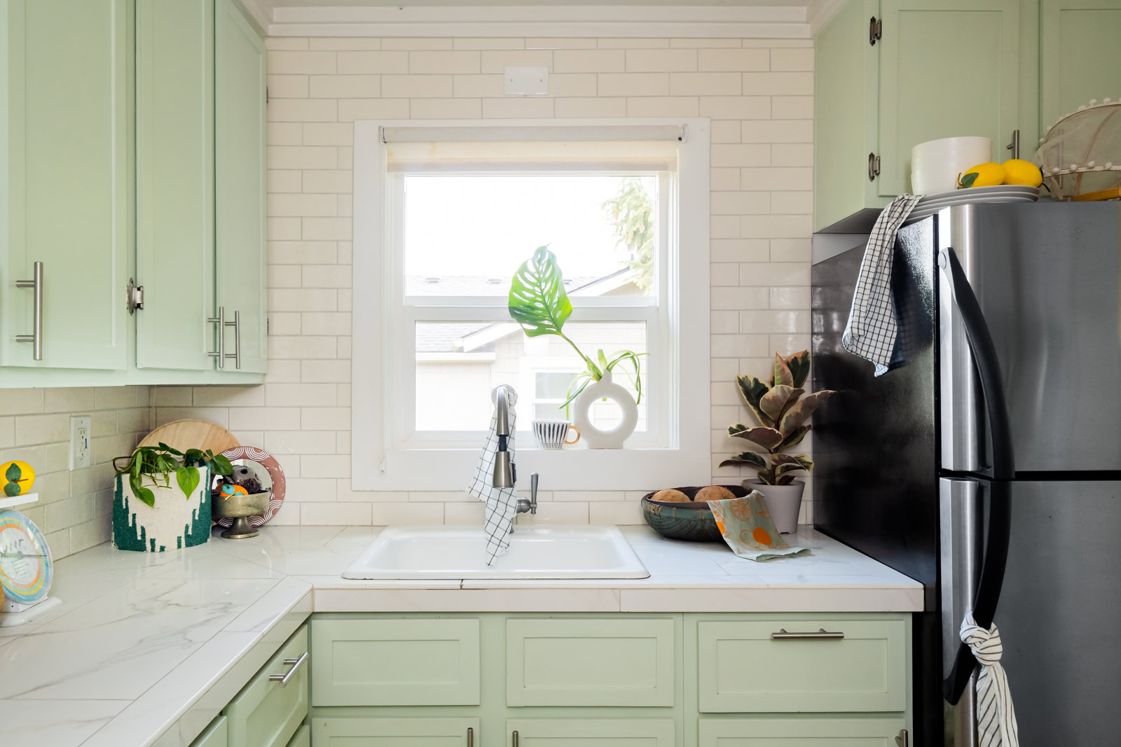 Updated kitchen with quartz countertops, subway tile backsplash, built-in hutch, laundry and gas appliances