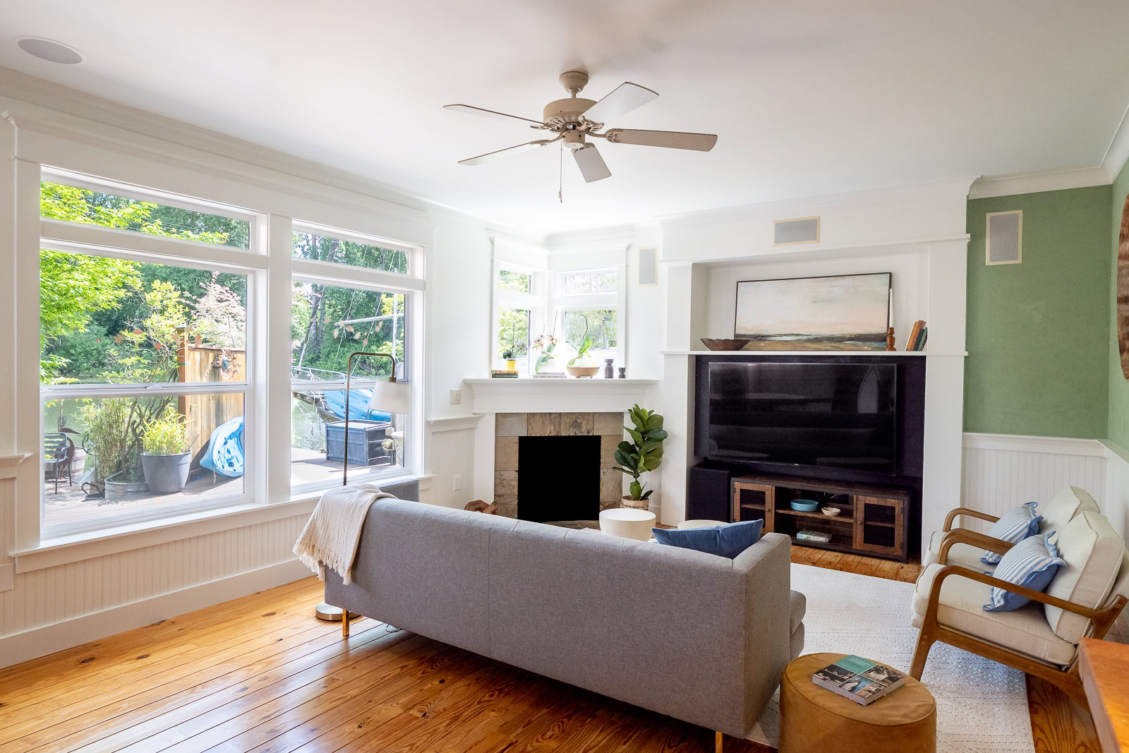 Light-filled living room with large windows, gas fireplace and lovely built-ins