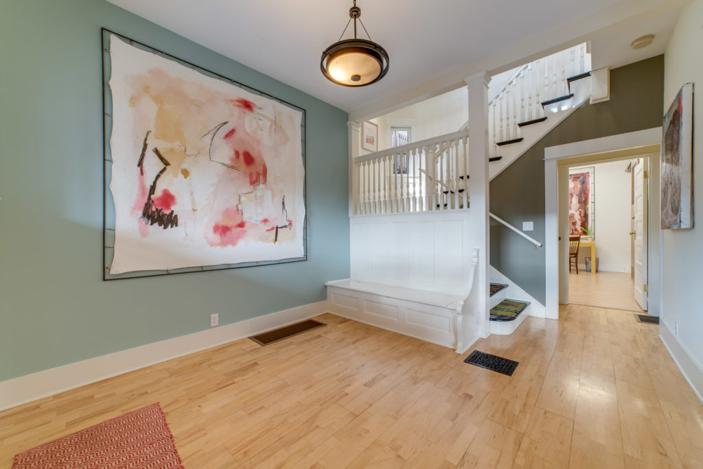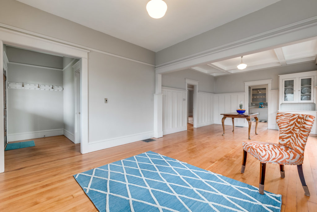 Living room features elegantly updated mantle and a gas fireplace. Original wood floors and unpainted classic woodwork warm the home.