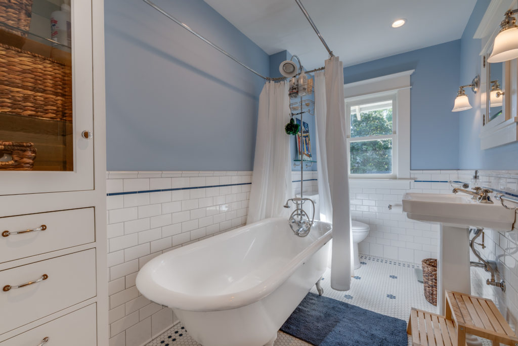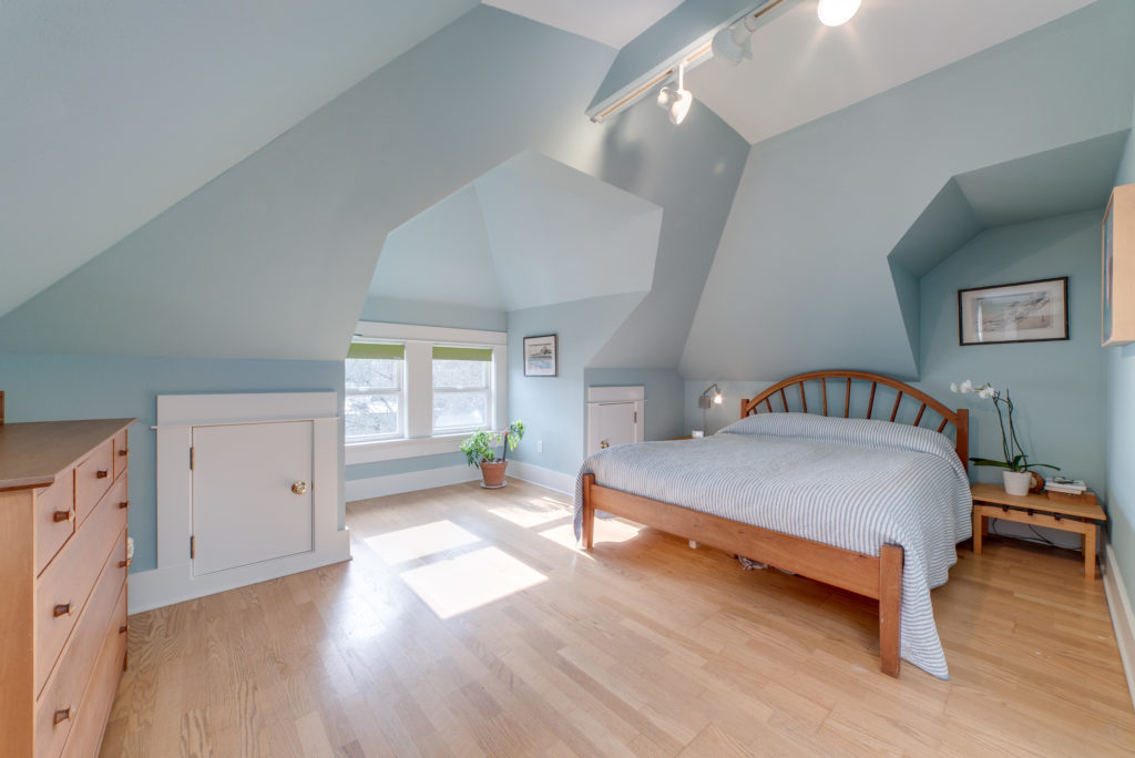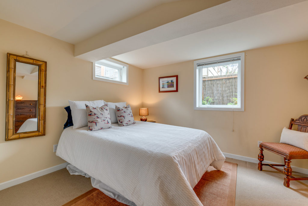 There are 2 light filled bedrooms upstairs with full closets. Stylishly updated, full bathroom upstairs with refinished clawfoot tub and skylights.