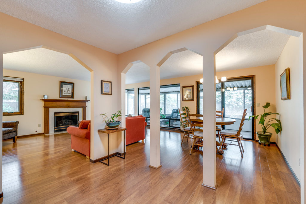 Entering the foyer and into the living room, you are immediately greeted with vaulted ceilings and wonderful natural light. Open to the living room is a large dining room with plenty of room for relaxation and gatherings alike!