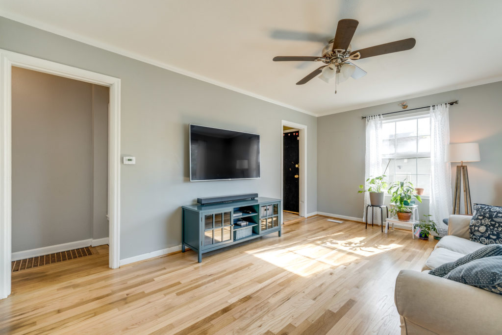 The living room is open and inviting with original hardwood floors and a beautiful picture window. This home has great natural lighting with so many windows and custom blinds from Smith & Noble!