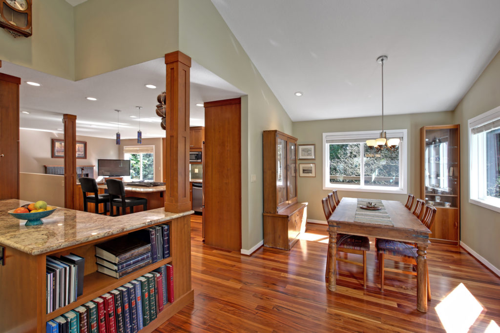 Formal dining room with built-ins is perfect for entertaining, flowing into the open concept kitchen.