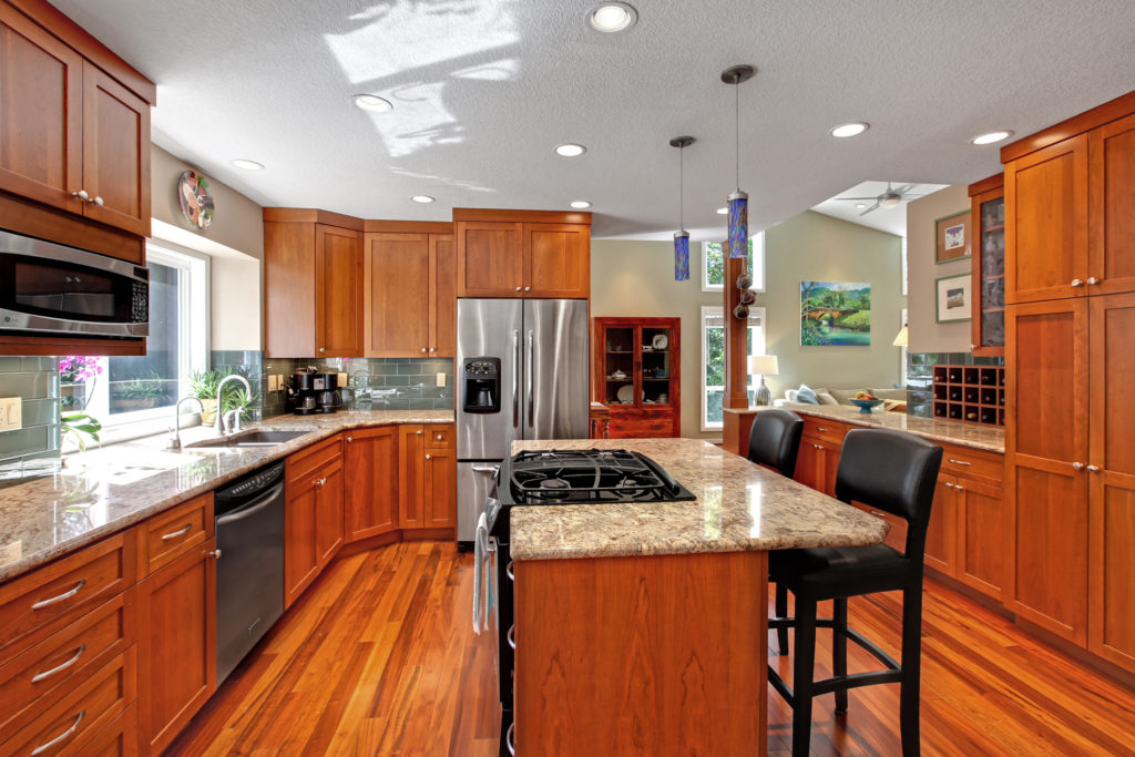 Make your way through the heart of the home and you’ll find an open concept kitchen with an eating bar that flows nicely into a family room. Big windows overlooking the backyard and a wood fireplace make this space feel both spacious and inviting.