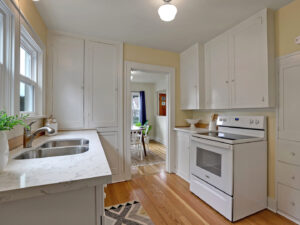 Take in the character of the home as you make your way seamlessly from the living room into the kitchen with tasteful modern updates and timeless period finishes. A picture-perfect dining nook rounds out the kitchen. Updates include newer integrated dishwasher, fridge, gas range with range hood, wood floors, solid wood cabinets and countertops, sink and white oak hardwood floors. Through the hall you’ll find 2 lovely bedrooms with tall windows. The well-maintained bathroom features a claw-foot tub with shower.