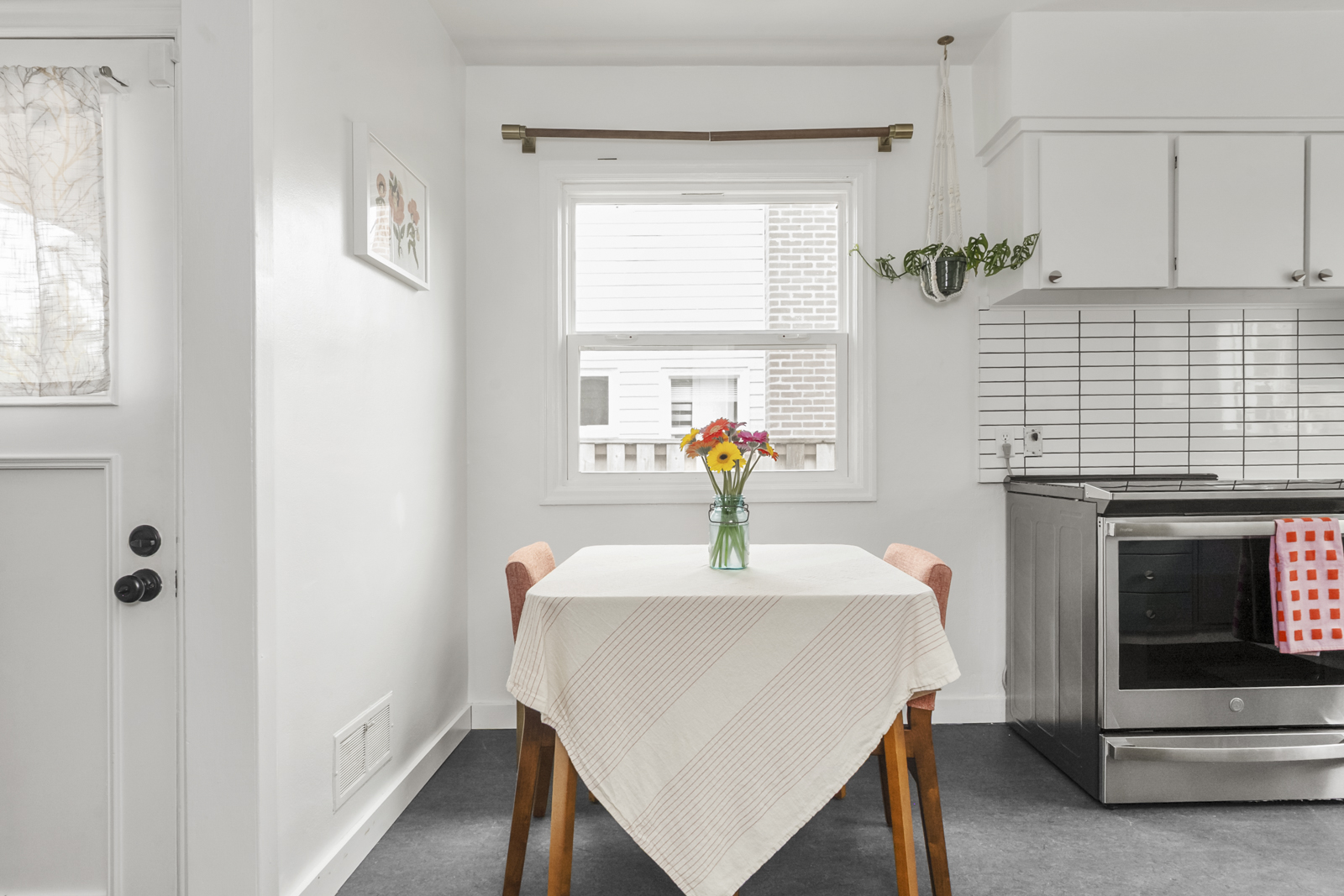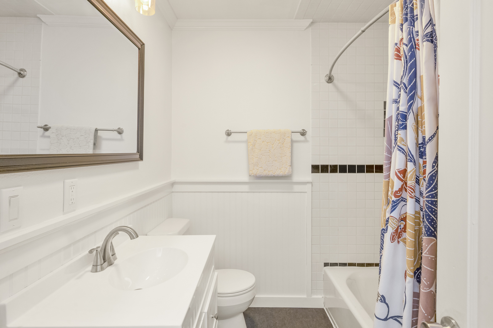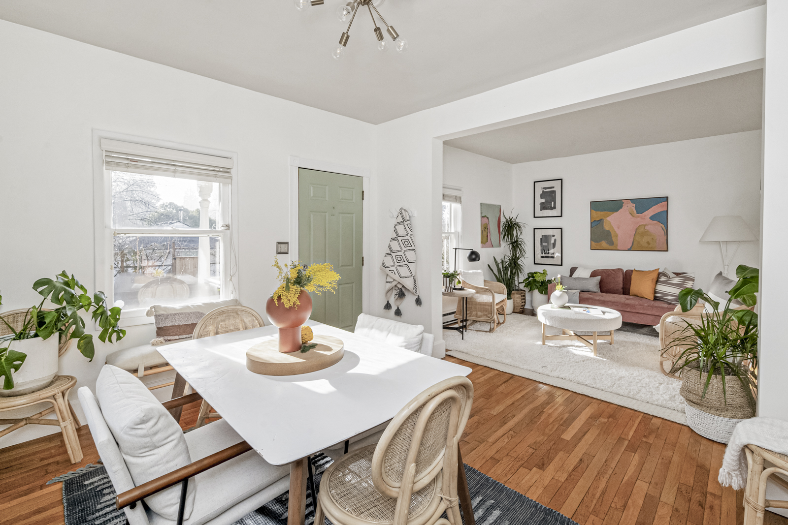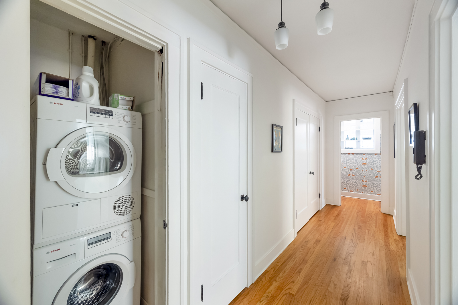 The spacious living room opens to a comfortable dining room and an updated kitchen, featuring a back door that leads outdoors to a gated area. Upstairs, you’ll find two spacious bedrooms, each with a walk-in closet, and a beautifully updated bathroom featuring a jetted tub, era-appropriate finishes, and a convenient washer and dryer.