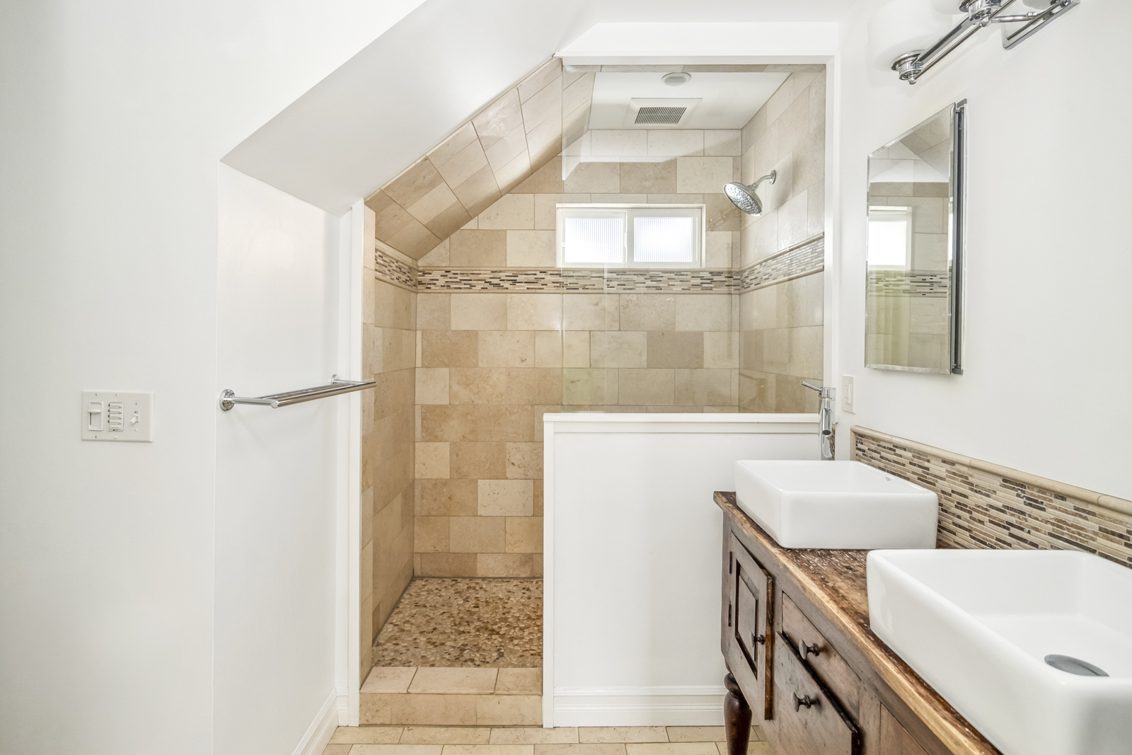 The kitchen features newer appliances, quartz countertops, and a convenient breakfast bar for entertaining while you cook. Upstairs, find two spacious bedrooms, each with a recently remodeled ensuite bath featuring sophisticated designer finishes.
