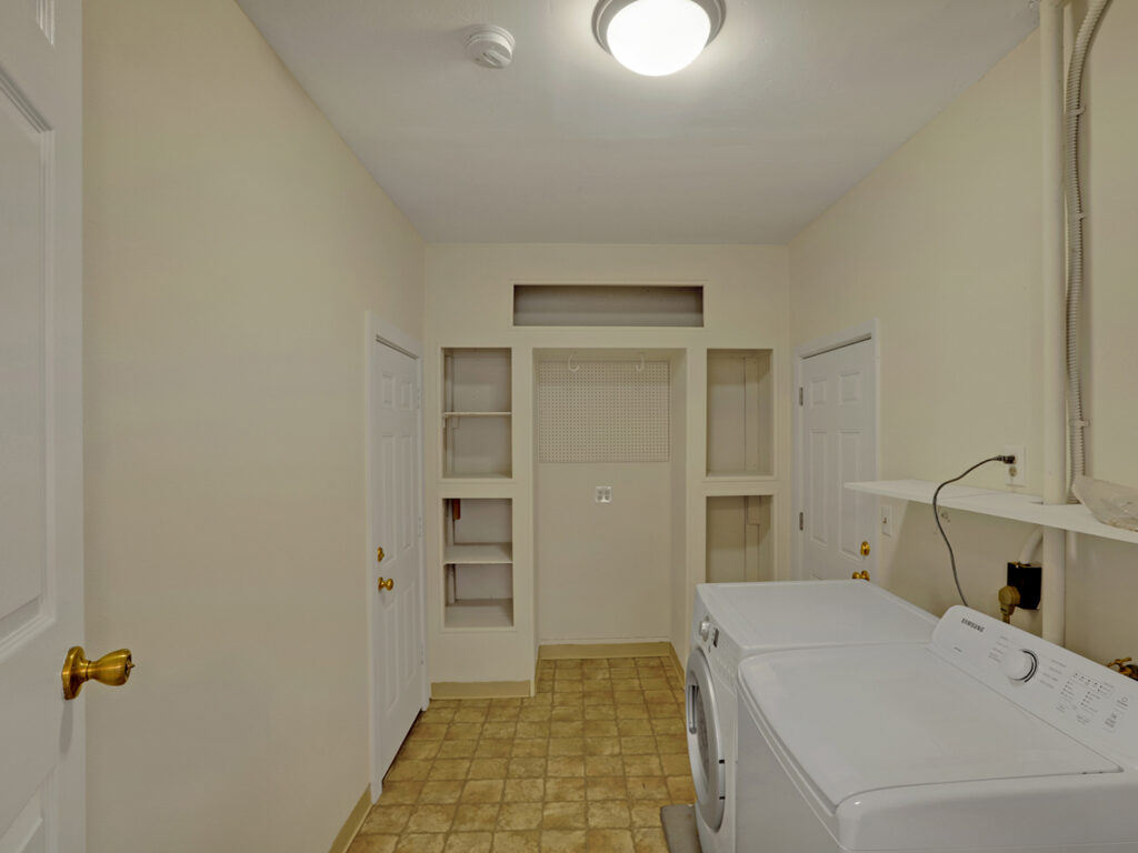 Moving past the family room, you’ll find a large laundry/mud room with a sink, conveniently connecting to the 2 oversized car garage. The garage has built-in shelving and plenty of extra room for storage.