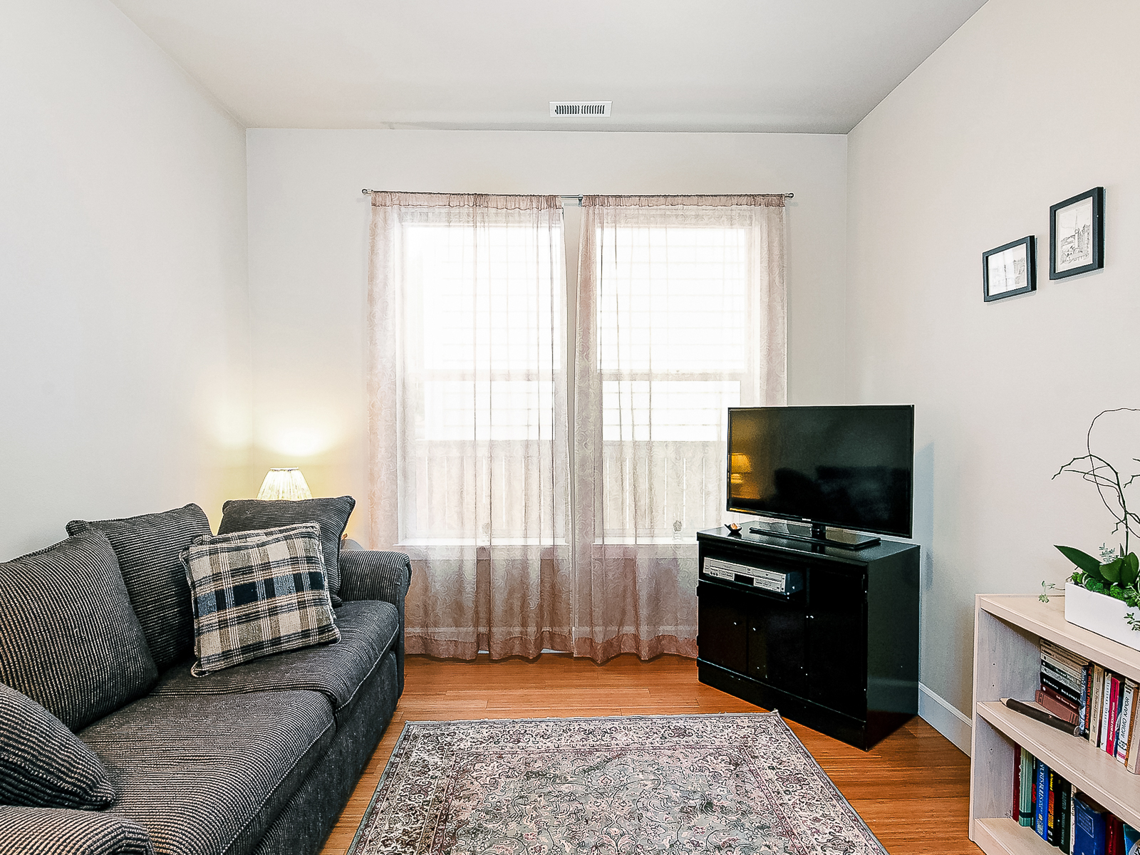 As you enter, you are greeted by an inviting living room featuring hardwood floors and a big picture window to let the sunshine in.