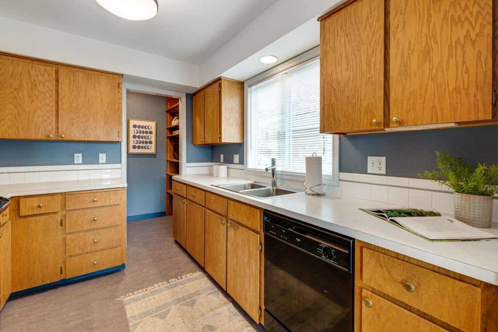 This is the Mid-Century Ranch you’ve been looking for! Picture perfect, this 1950’s classic is located on a peaceful, quiet street in a mature neighborhood, and is surrounded by gorgeous landscaping, majestic fir trees, and graceful Japanese maples. A lovely entrance with a generous foyer draws you into the heart of the home– a warm and inviting living room with rich wood paneling, classic brick fireplace, and a huge picture window with a view out to the park-like backyard. Hardwood floors, beautiful millwork, and modern lighting create a warm and inviting atmosphere, perfect for cozying up with a good book or playing a rousing board game by the fire.