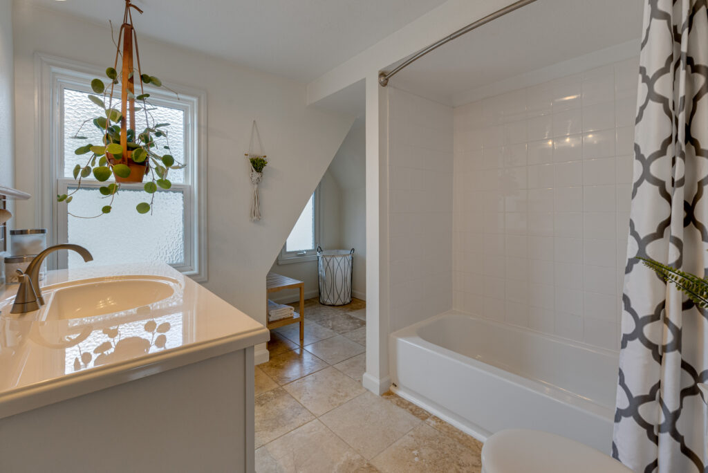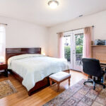 Away from the kitchen toward the other end of the home, you’ll find three quiet, light-filled bedrooms with beautiful millwork, warm wood floors, and ample closets. A roomy modern bathroom with double sinks and stylish updates accommodates everyone during the morning rush, or in the evening allows a relaxing soak in the tub before bed.
