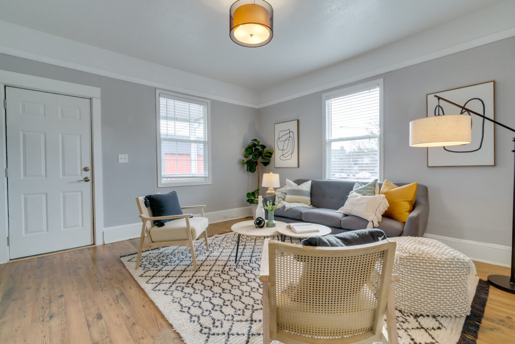 This delightfully dialed-in Montavilla home is stylish and move-in ready. The cheery, bright yellow door welcomes you into a lovely light-filled living space with hardwood floors, tasteful colors, and updated light fixtures. The large L-shaped living room area overlooks a beautiful front garden that’s cheerful even on a rainy day when water trickles down the rainchains at the front porch overhang.