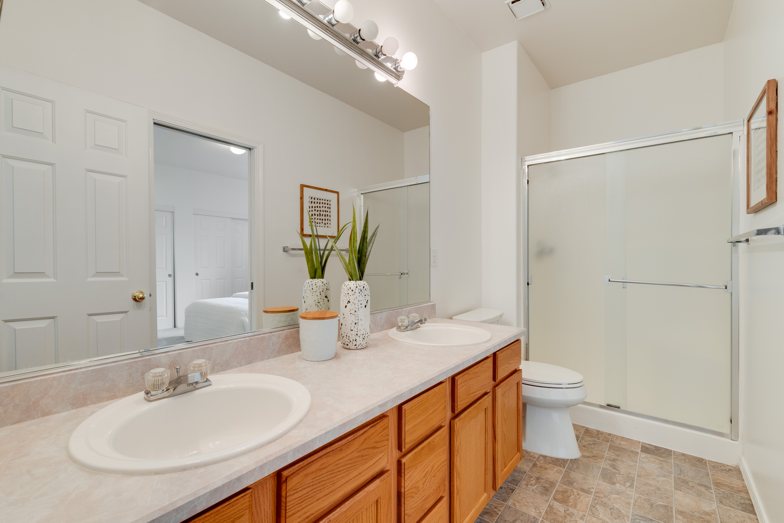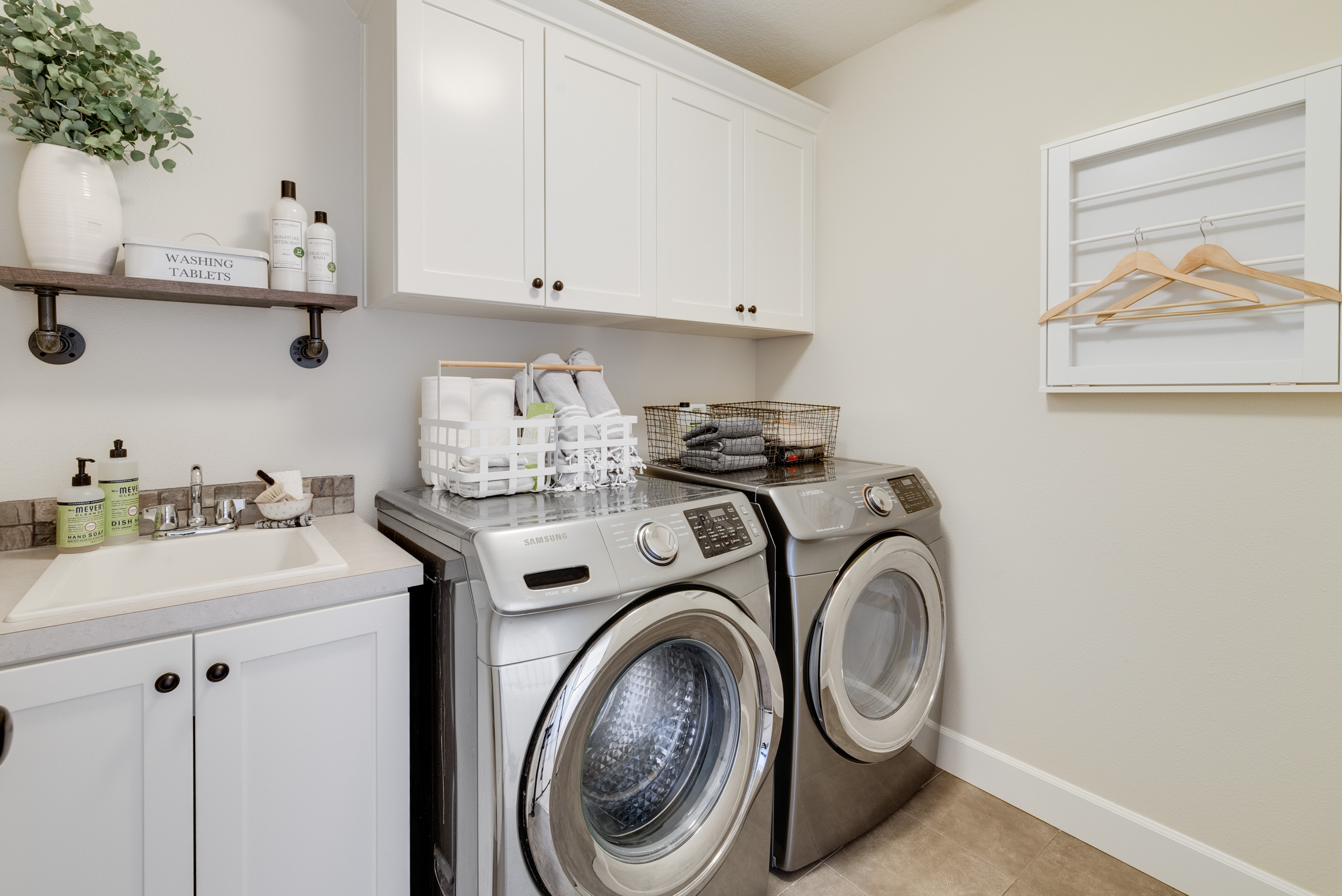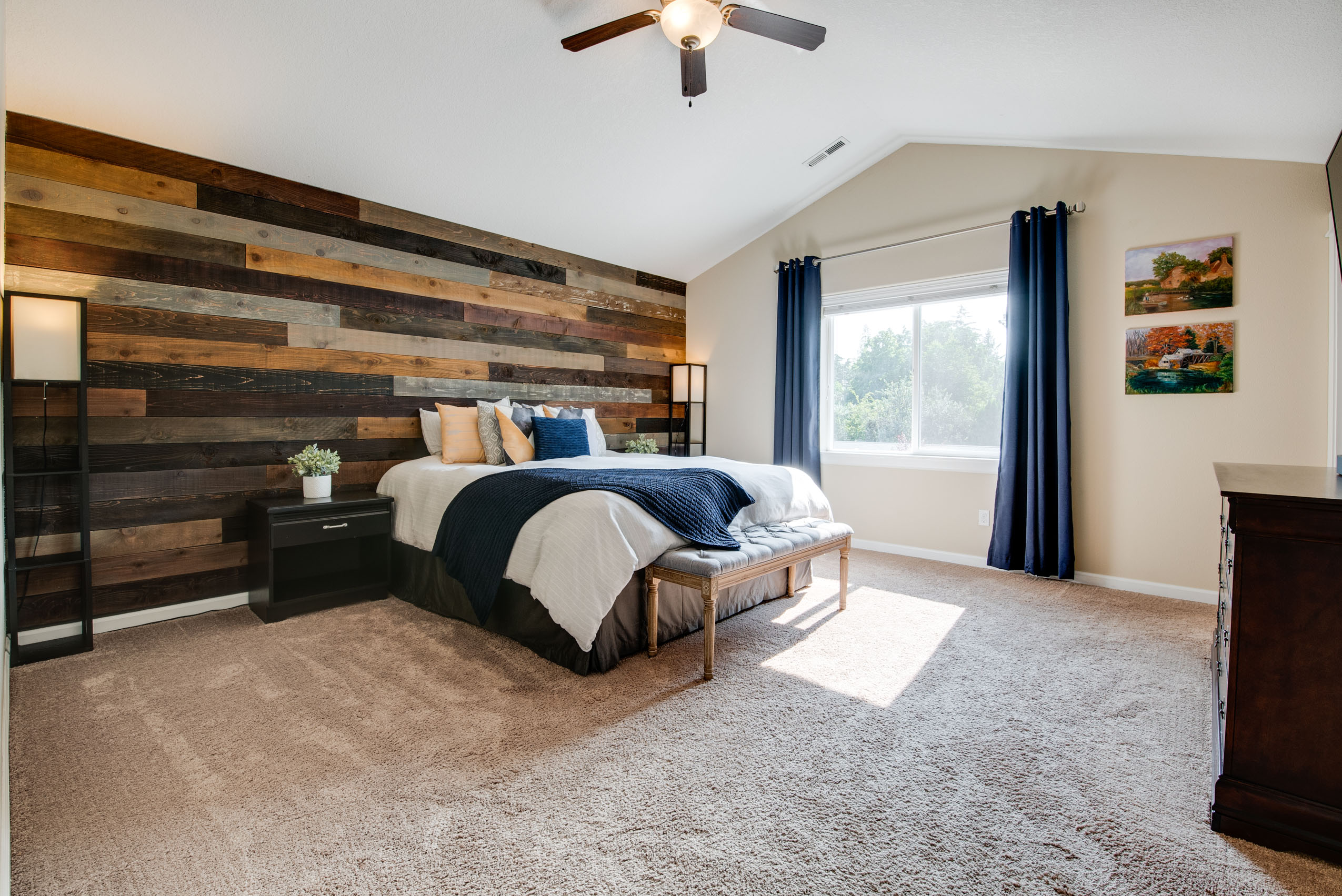 Upstairs, the vaulted owner’s suite features a reclaimed wood accent wall, ceiling fan, large walk-in closet & en suite bath with dual sinks. Two additional bedrooms are light and bright with standard closets. The laundry area has built-in cabinetry and a hanging bar.