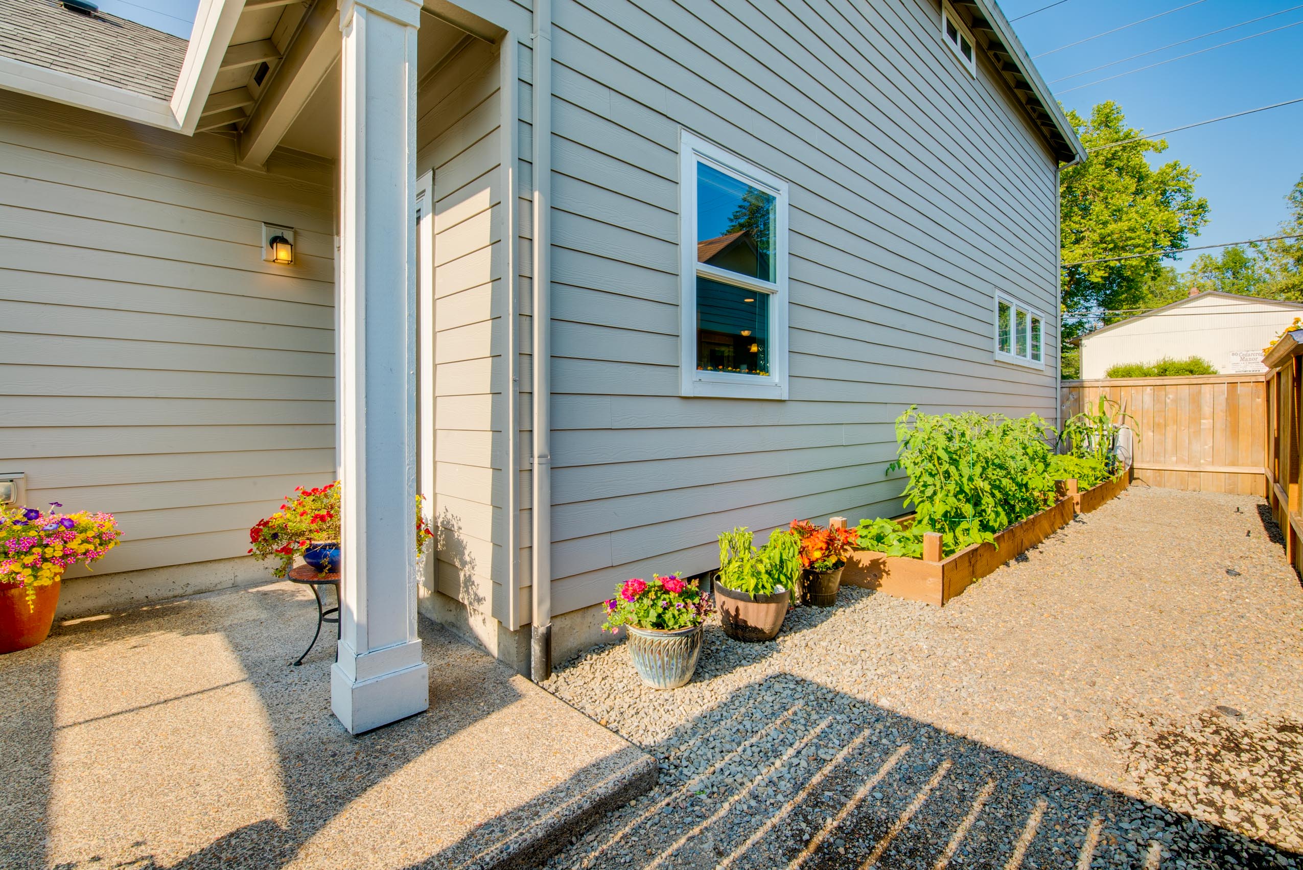 A covered front porch and back deck, a perennial garden, and raised beds in the front yard make for a comfortable, charming outdoor space.
