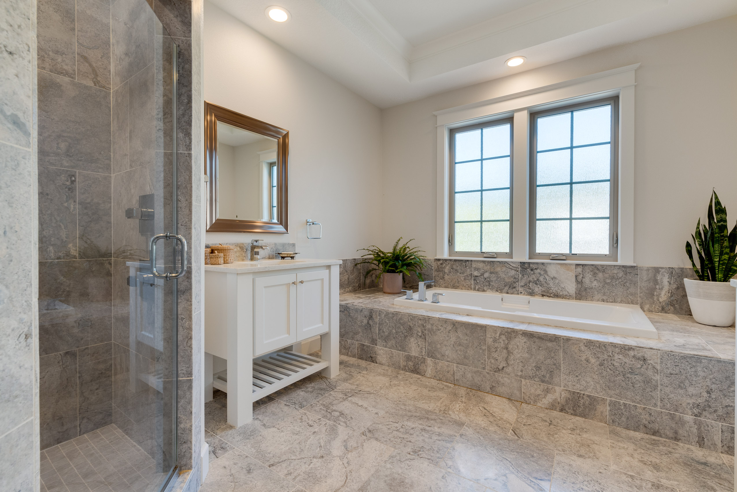 Gorgeous master bath with tiled walk-in shower, soaking tub, dressing area and walk-in closet. Fourth bedroom could also be a bonus room. Large windows with views of the trees and a south facing backyard that provides filtered natural light throughout the day.