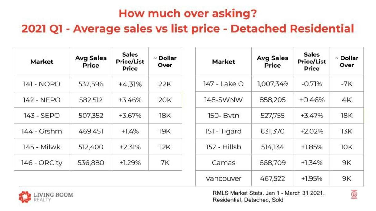 Our company evaluated the numbers for residential homes sold in quarter one. The numbers above include all types of residential housing, including fixers and attached homes. With this said, how much should you plan to pay for your home? That super cute, dialed, right priced home right now is likely going to sell for much higher than the numbers below suggest. Call us for more details and we will help you navigate Portland’s current market.