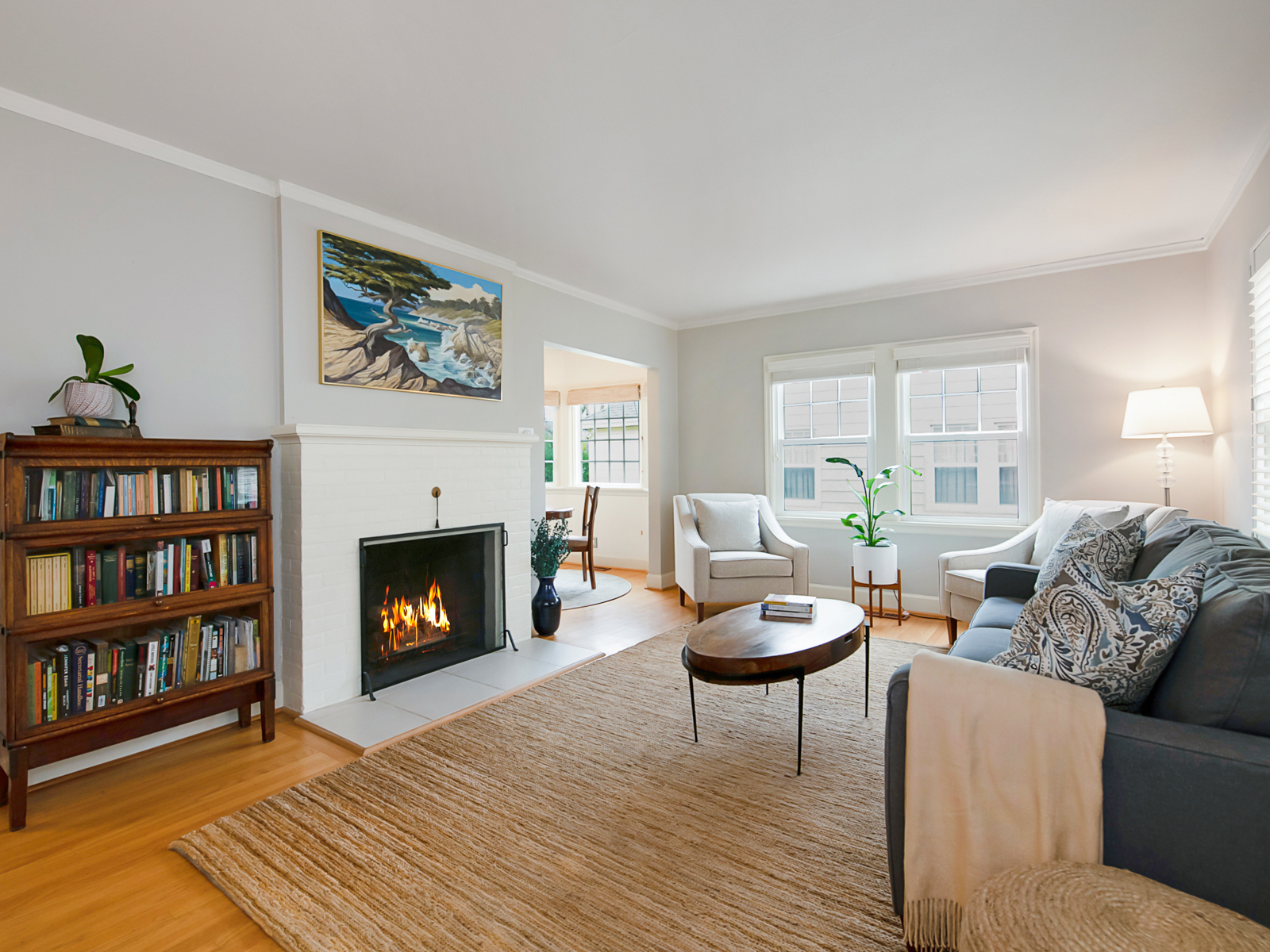 – Open and bright living room with large windows & lovely built-ins